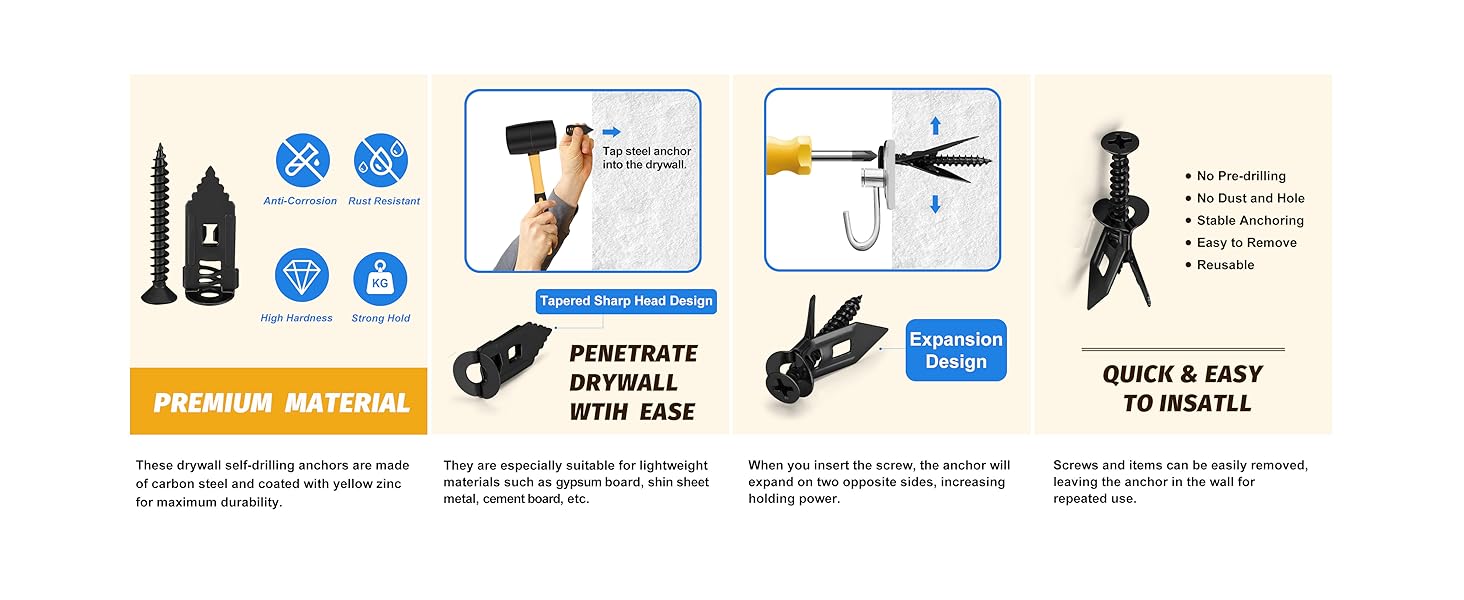 • ثقب ذاتي، لا حاجة إلى ثقب مسبق، يتم تثبيت طرف الثقب الذاتي الحاد مباشرة على الحوائط الجافة باستخدام مفك براغي - سريع ونظيف ومثالي للمستأجرين أو مستخدمي الأعمال اليدوية.