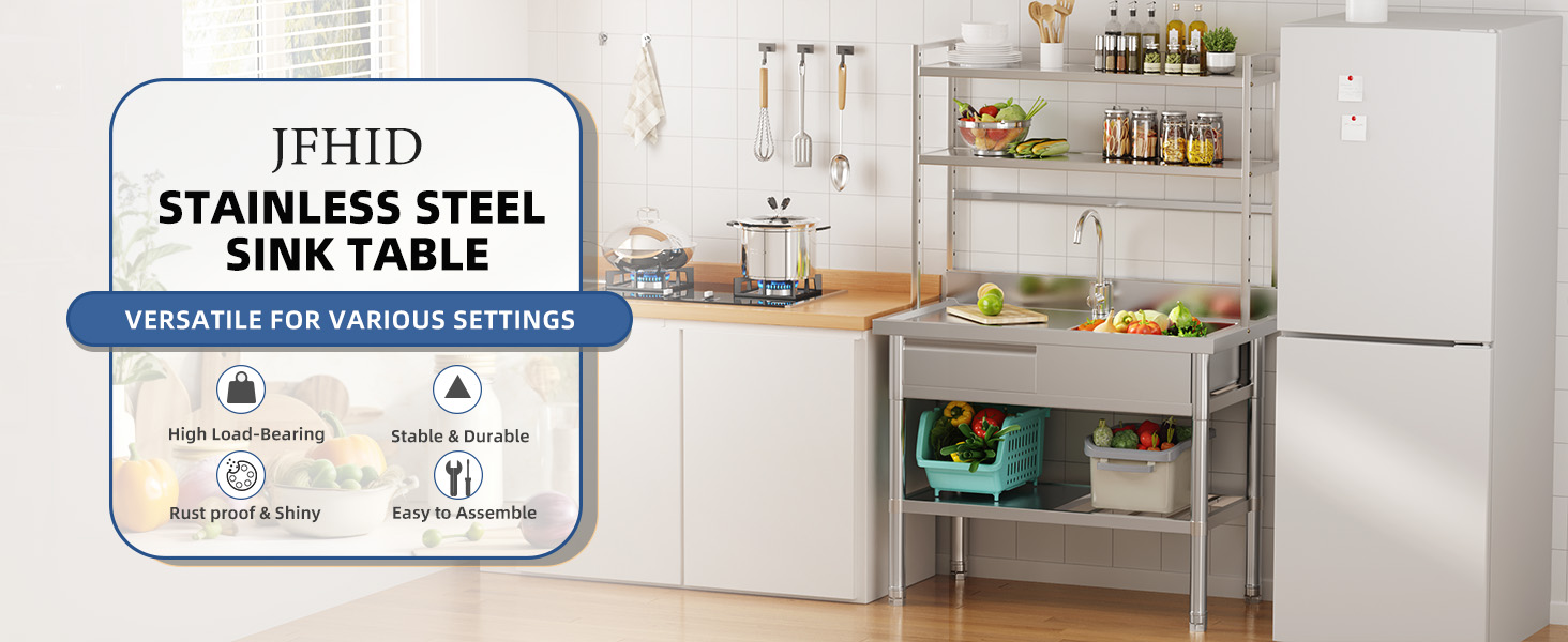 حوض متعدد الإمكانات - حوض JFHID القائم بذاته يجمع بين وعاء واحد عميق ومنضدة عمل إعدادية ودرج تخزين ورف سفلي في تصميم واحد مدمج. مجهزة بأنابيب مدخل المياه الساخنة والباردة وصنبور دوار 360 درجة، مما يخلق محطة غسيل وتحضير مريحة للمهام اليومية