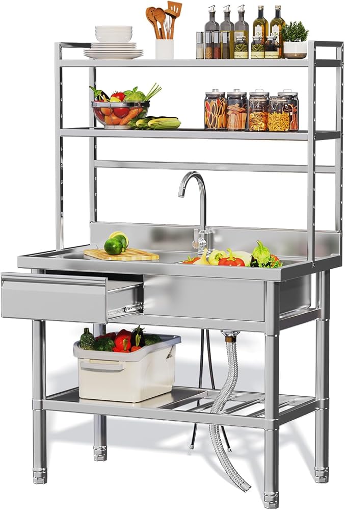 حوض مرافق من الفولاذ المقاوم للصدأ مع أرفف، أحواض مطبخ تجارية ذات وعاء واحد قائم بذاته مع درج وأنابيب مياه، منضدة عمل على سطح الطاولة من الفولاذ المقاوم للصدأ لمطعم المنزل