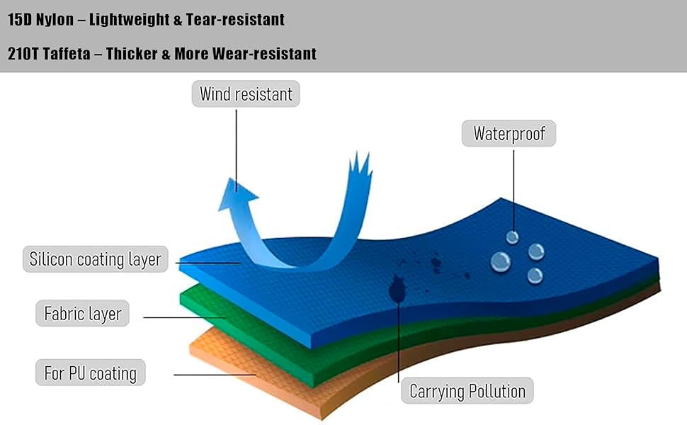 • نسيج السيليكون المطلي بالنايلون 15D: خفيف الوزن وشبه شفاف وناعم ومريح. استخدام طلاء السيليكون أحادي الجانب وتقنية طلاء البولي يوريثان العكسي يعزز قوة النسيج وتأثيره المقاوم للماء، مع خصائص مثل تأثير طارد الماء لأوراق اللوتس، وخفيف الوزن، ومقاومة التآكل، ومقاومة التمزق، والقوة العالية.