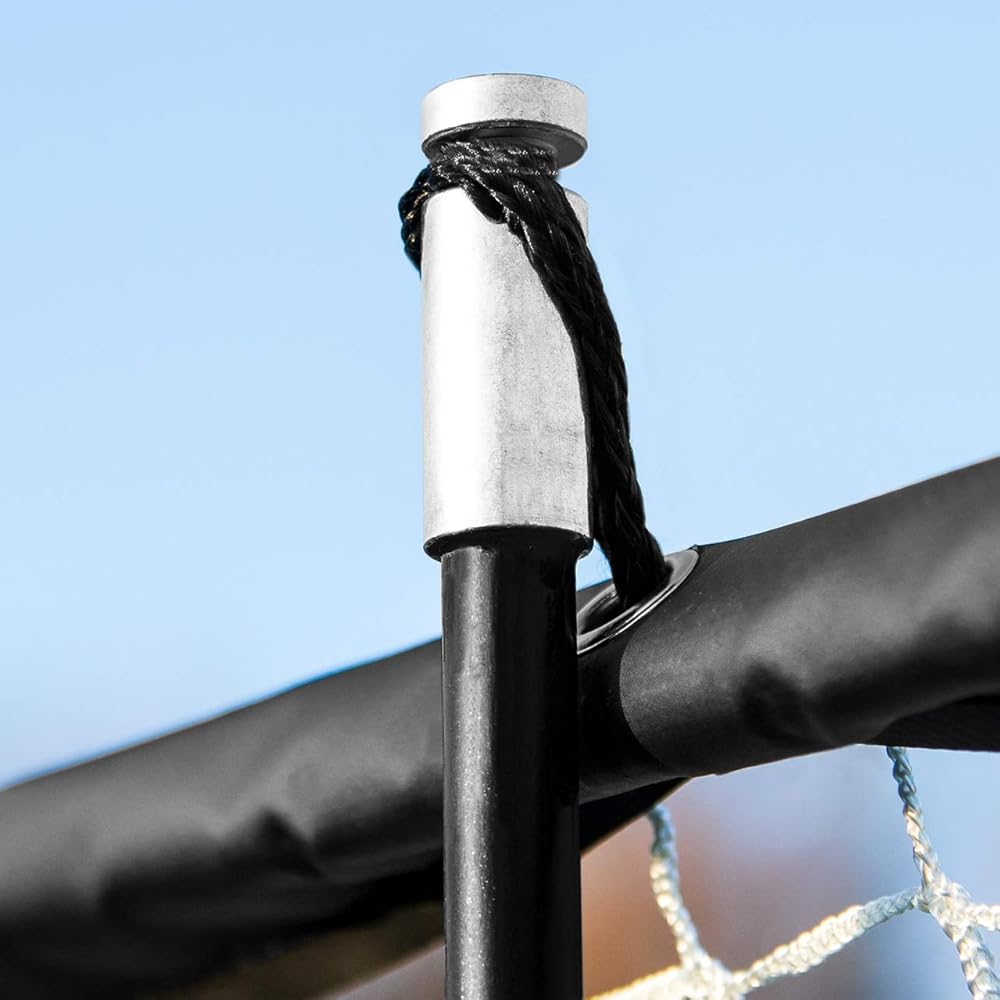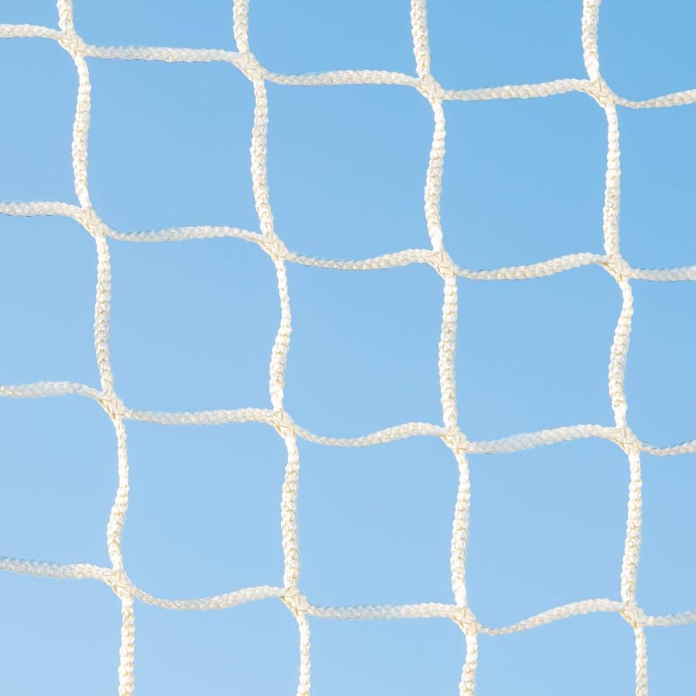 شبكة عالية الجودة - مزودة بشبكة بوليستر بيضاء بدون عقد مكونة من 4 طبقات مع مربعات شبكية مقاس 45 مم وشريط أكسفورد. يوفر هذا البوليستر الخالي من العقد القوة القصوى للشبكة، مما يجعلها قادرة على تأمين كرات كرة القدم بأمان وبسرعة عالية.