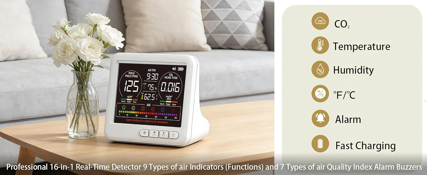 【شاشة احترافية لجودة الهواء 16 في 1 في الوقت الحقيقي】: مع الكشف في الوقت الحقيقي عن PM1.0 | بي ام 2.5 | بي ام 10 | ثاني أكسيد الكربون | TVOC | هكو | تيم | HUM، بالإضافة إلى 7 أنواع من وظائف التنبيه والجرس AQI، تضمن لك هذه الشاشة معرفة دائمًا ما يوجد في الهواء من حولك.
