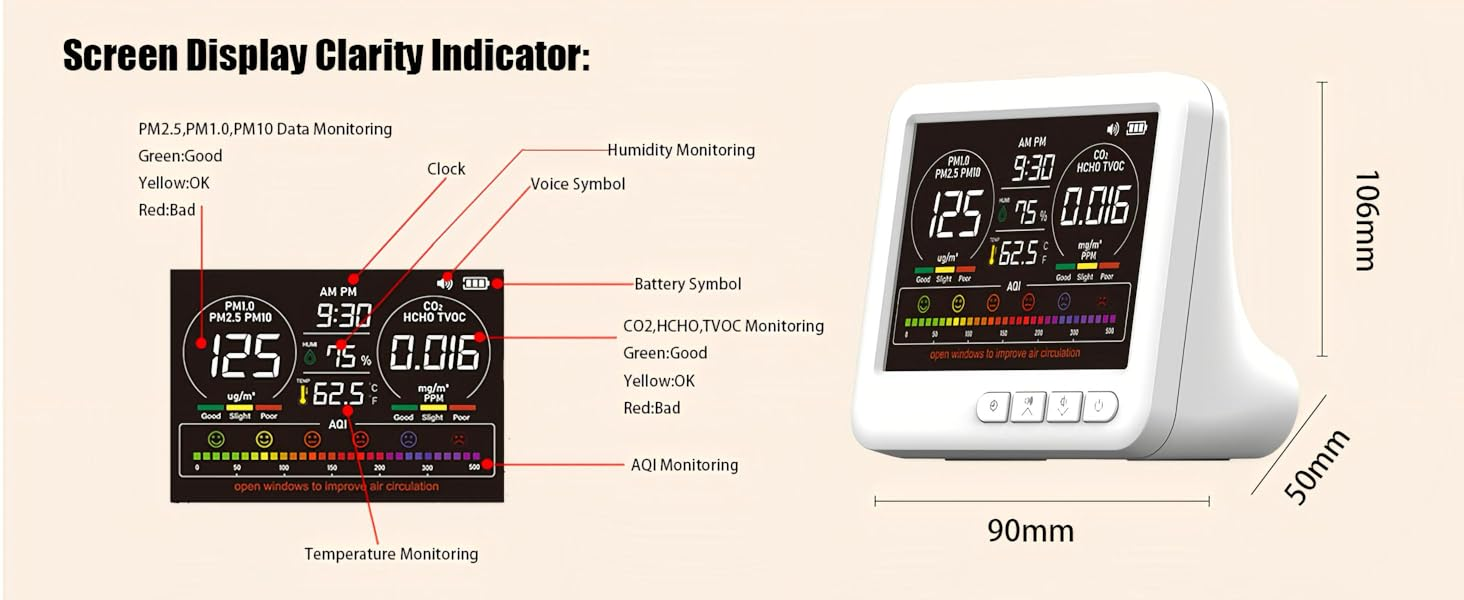 【نظام استشعار عالي الدقة وشاشة كبيرة عالية الدقة】: يقوم نظام الاستشعار عالي الدقة بجمع وتحليل بيانات الهواء بشكل مستمر كل 3 ثوانٍ، مما يوفر لك تحديثات مستمرة حول جودة الهواء في مساحتك. تعمل الشاشة الملونة الواضحة والمتقدمة على تحسين إمكانية القراءة وتضيف لمسة من الرقي إلى بيئتك.