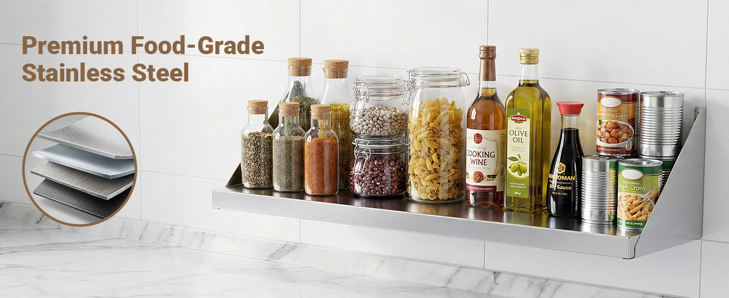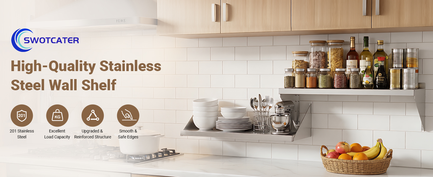 • 【دعامات مبتكرة قابلة للعكس وموفرة للمساحة】مع تصميم دعامة فريد قابل للتعديل، قم بتركيب الدعامات لأعلى كدعامة خلفية واقية لمنع العناصر من السقوط، أو قلبها لأسفل للحصول على رف عائم أنيق من الفولاذ المقاوم للصدأ. يسمح تصميم الأرفف المعيارية المصنوعة من الفولاذ المقاوم للصدأ بالتركيب المرتبط أو المتدرج، مما يزيد من مساحة الجدار الرأسية في المطابخ التجارية أو المطاعم أو المخازن الضيقة.