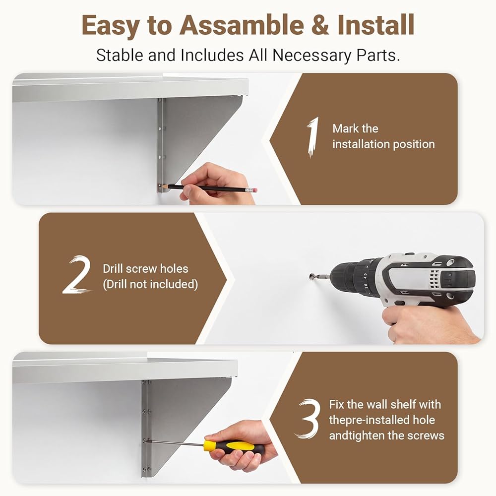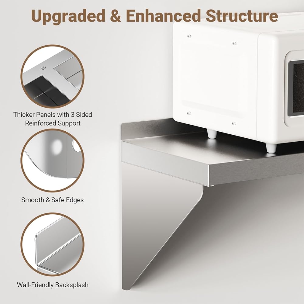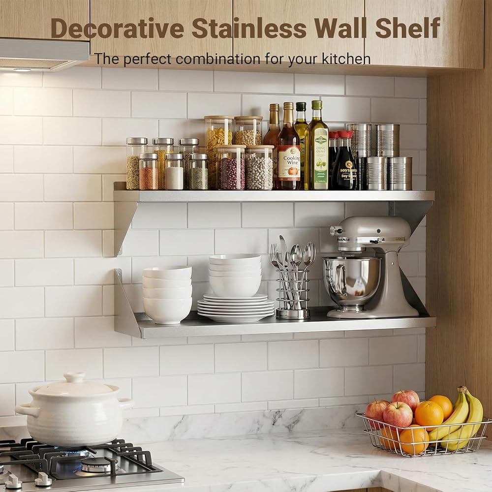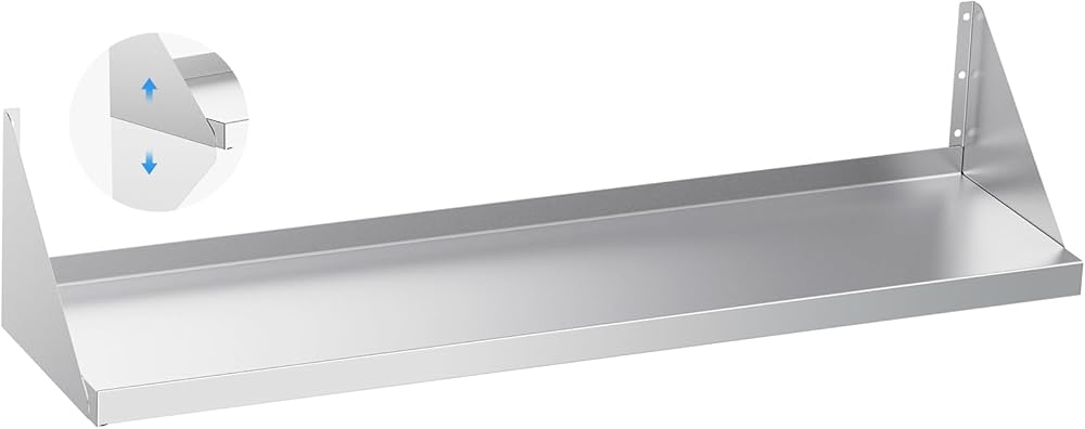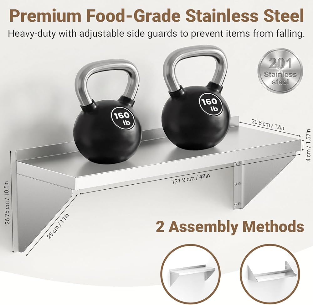 رف من الفولاذ المقاوم للصدأ مثبت على الحائط مقاس 12 بوصة × 48 بوصة 320 رطل، أرفف تجارية من الفولاذ المقاوم للصدأ مع أقواس قابلة للعكس، رفوف معدنية عائمة شديدة التحمل للمطبخ، المطعم، المرآب، البار