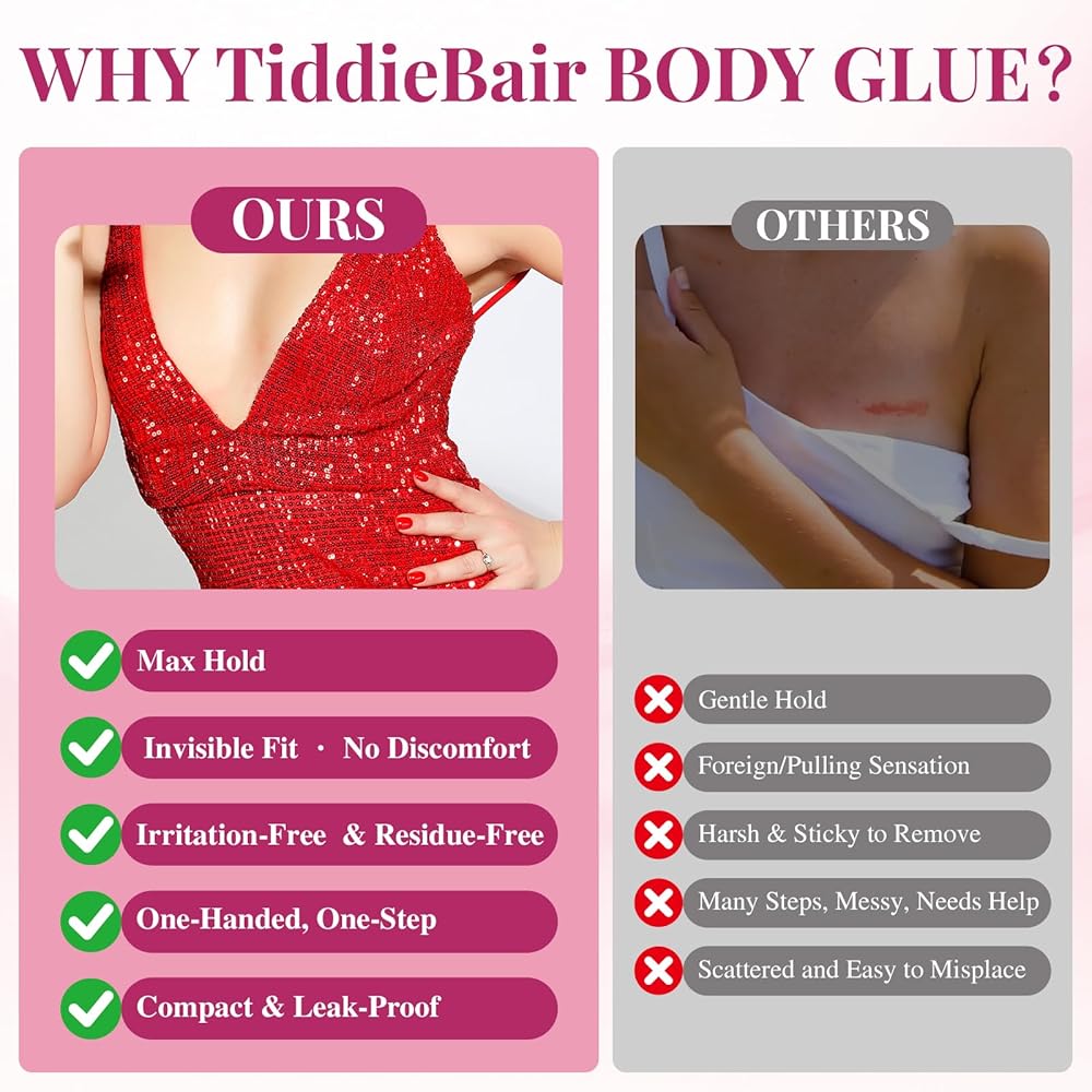 Tired of fashion tape that peels off mid-event, or other body adhesives that are impossible to remove without a fight? You deserve a solution that actually works. If you've ever spent a night adjusting your strapless dress instead of dancing, you know that frustration firsthand. Fashion tape claims to lock your look in place—but it always disappoints: slipping off after hours, leaving sticky gunk on your clothes, and bailing when you need it the most. How to Use Apply a thin layer to clean, dry skin. Wait 30-60 seconds until the formula turns tacky. Press your fabric firmly against the area. That's it—you're set for the whole day (or night!). Gentle on Skin, Tough on Slips ✅ Hypoallergenic formula free of latex and acrylates, designed to prevent irritation ✅ Crafted by a founder with sensitive skin allergies, for anyone who wants effective hold without the reaction ✅ Sweat and humidity resistant (but not fully waterproof—no harsh oil-based removers required!) ✅ Patch test is recommended for those with extra sensitive skin