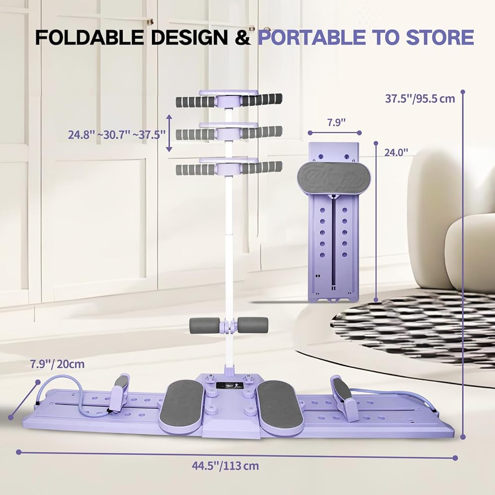 Foldable Design. Come with two resistance bands for you to keep balance and try more extension workout movements with this Pilates exercise board . Easy to install and fold up, room saving and portable to carry anywhere as you want