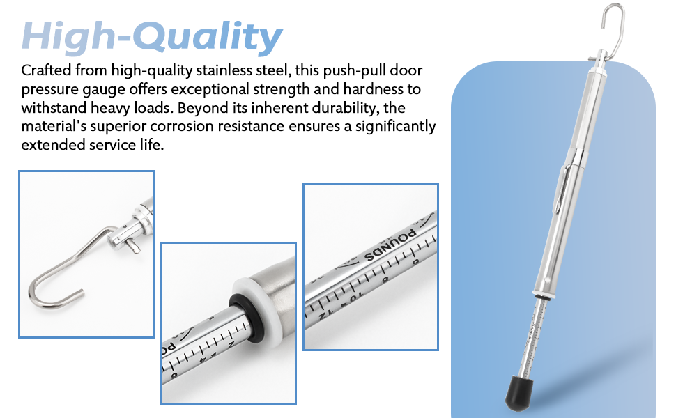 جودة عالية: مقياس ضغط باب الدفع والسحب مصنوع من مادة الفولاذ المقاوم للصدأ عالية الجودة، مع قوة وصلابة عالية، ويمكنه تحمل الأحمال الكبيرة. بالإضافة إلى كونها قوية ومتينة، فإن هذه المادة لديها أيضًا مقاومة للتآكل، مما يمكنها من إطالة عمر الخدمة بشكل فعال.