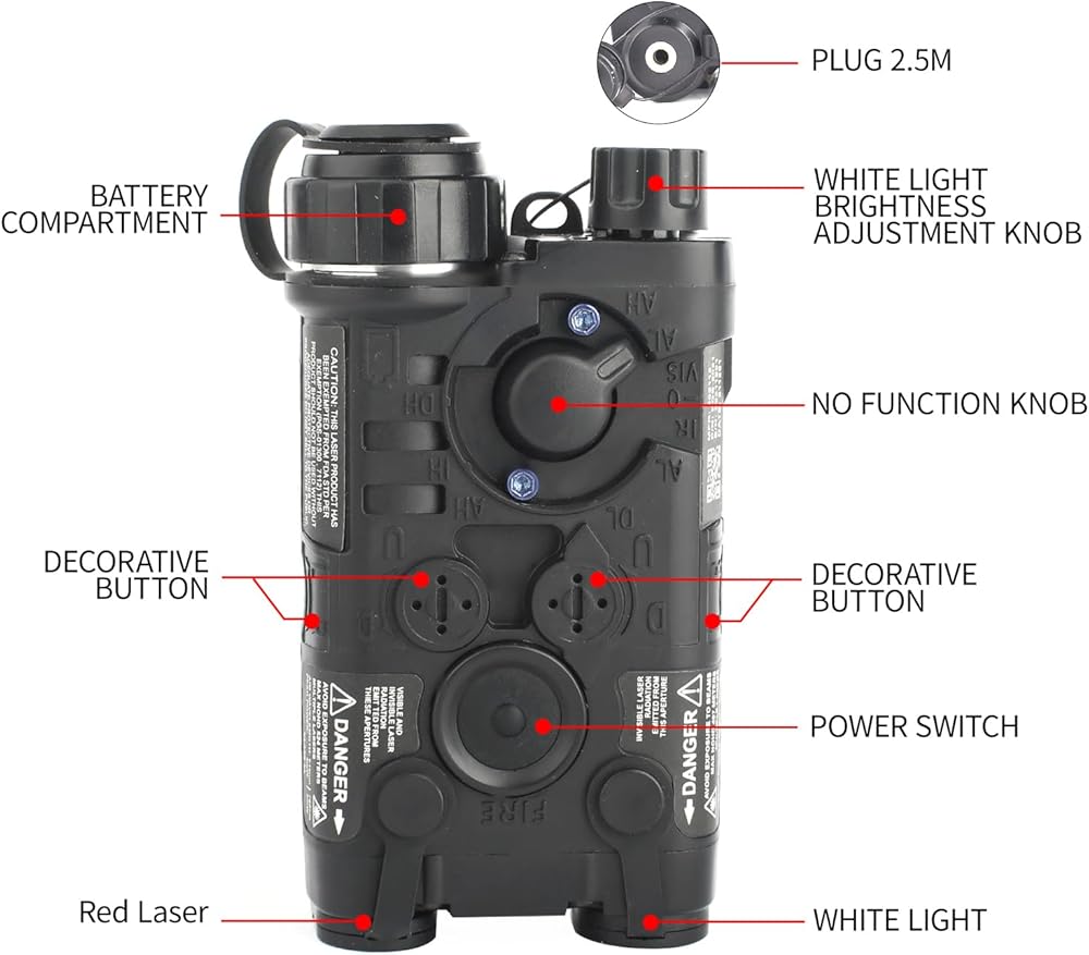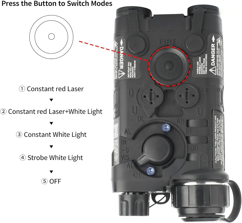 يتميز ليزر Airsoft PEQ بأربعة أوضاع: 1. الليزر الأحمر الثابت؛ 2. ليزر أحمر ثابت + ضوء أبيض. 3. الضوء الأبيض المستمر. 4. ستروب الضوء الأبيض
