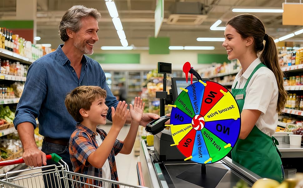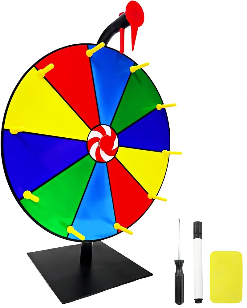 • متعددة الوظائف ومناسبة لمختلف المناسبات: الأداة المثالية للخطوبة! يُعد هذا العجلة الدوارة متعددة الاستخدامات المزودة بحامل مثاليًا لمجموعة واسعة من الأحداث. سواء أكانت ألعاب الكرنفال، أو العروض الترويجية للمعارض التجارية، أو مكافآت الفصل الدراسي، أو مسابقات الحفلات، أو سحوبات جمع التبرعات، فإنها تضيف على الفور عنصرًا من المرح التفاعلي الذي يأسر الحشود من جميع الأعمار.