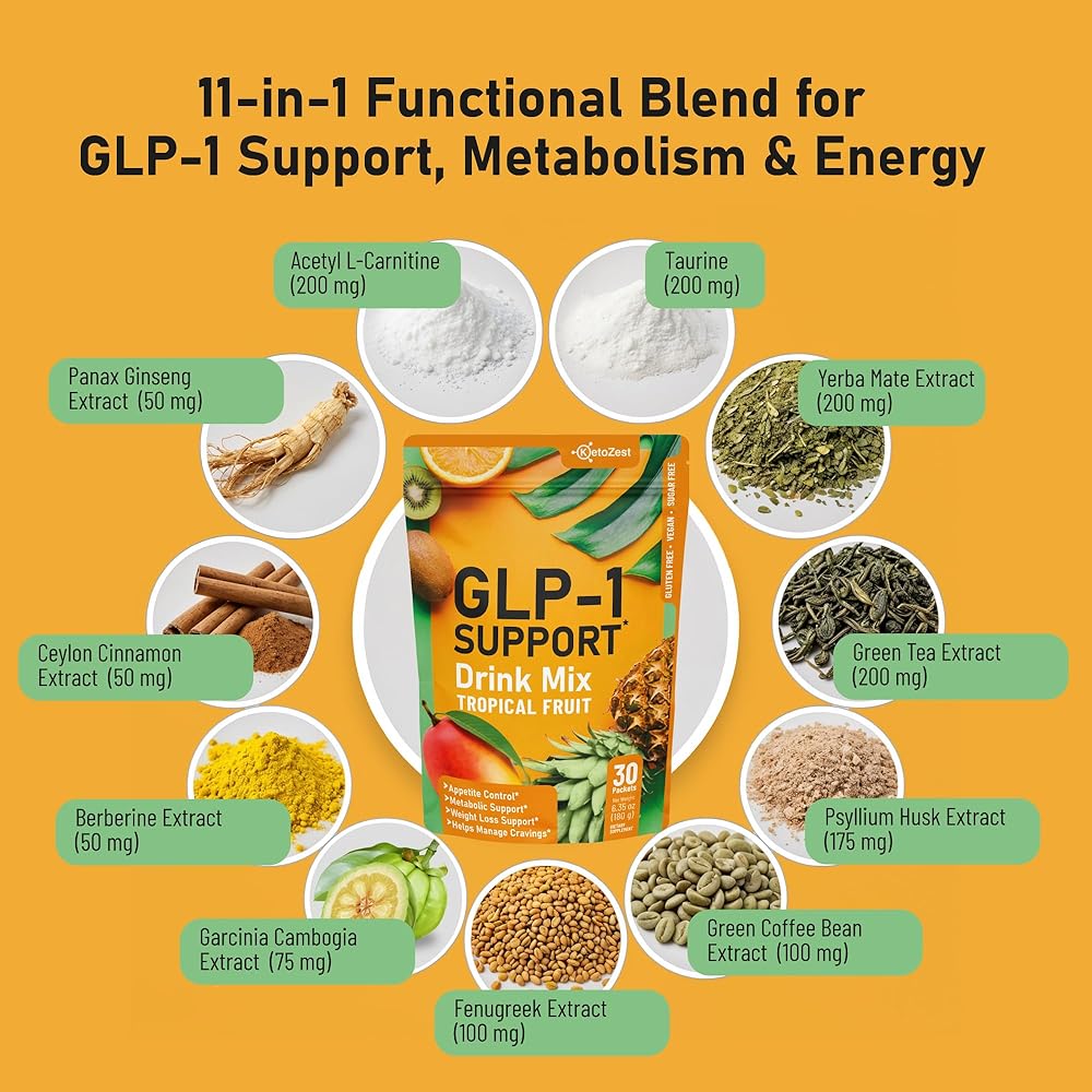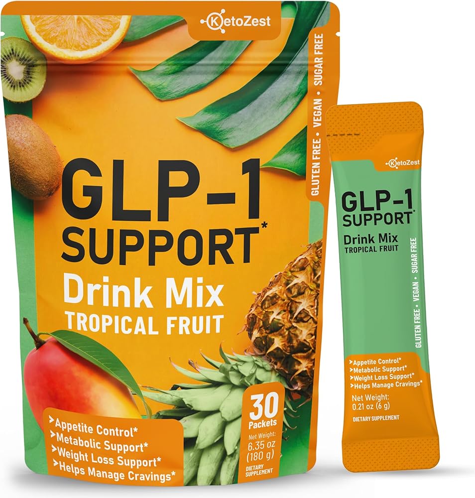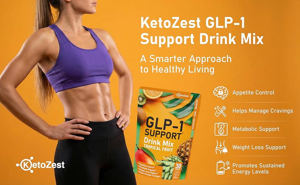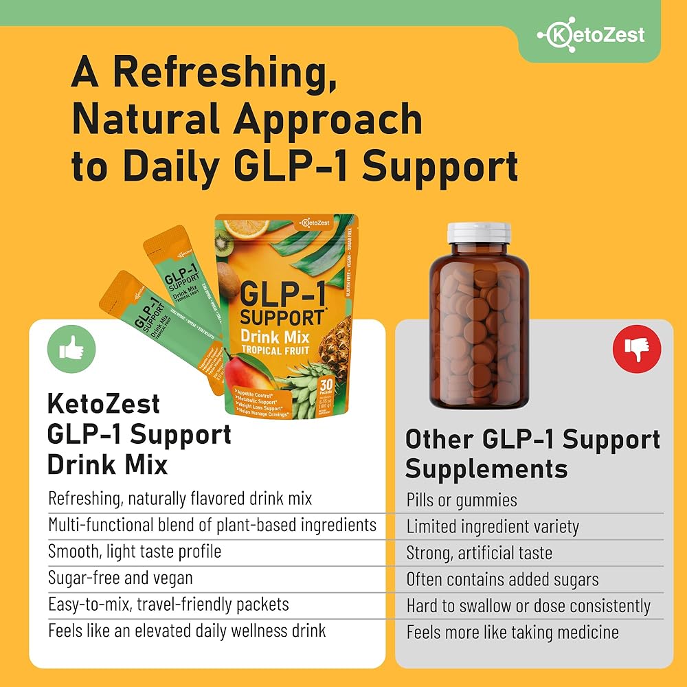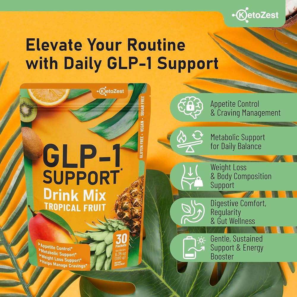 Convenient Tropical Fruit Packets for On-the-Go Wellness: KetoZest GLP-1 Support Supplement Drink Mix comes in 30 single-serve packets that mix easily with water to create a refreshing tropical fruit flavor. Each pack is sugar free, gluten free, and vegan, making it suitable for travel, work, or active lifestyles. These convenient daily mixes act as an everyday wellness activator, supporting digestion, energy, and metabolism as part of a consistent wellness routine.