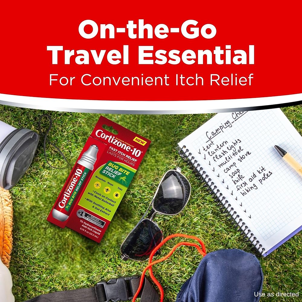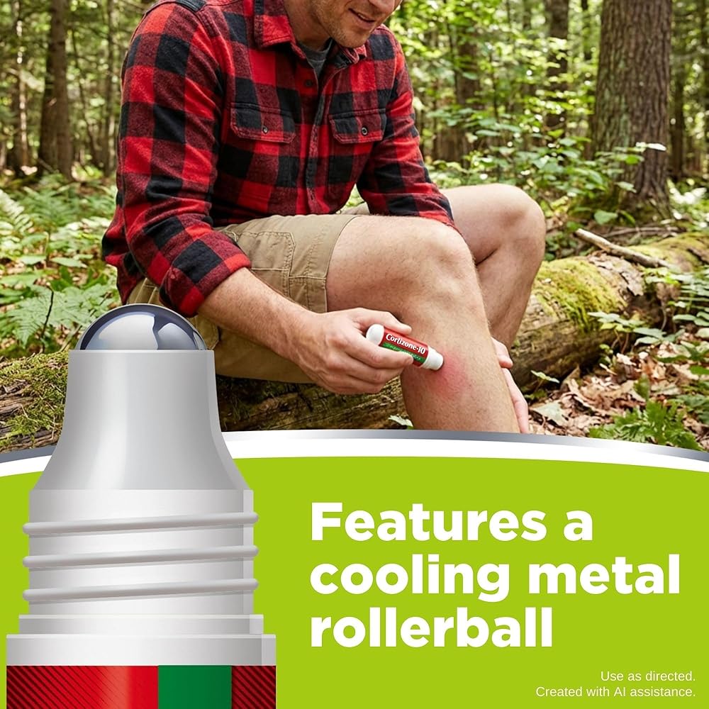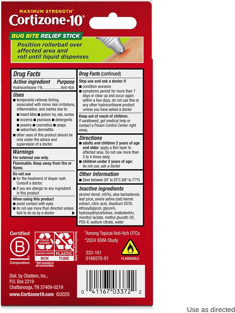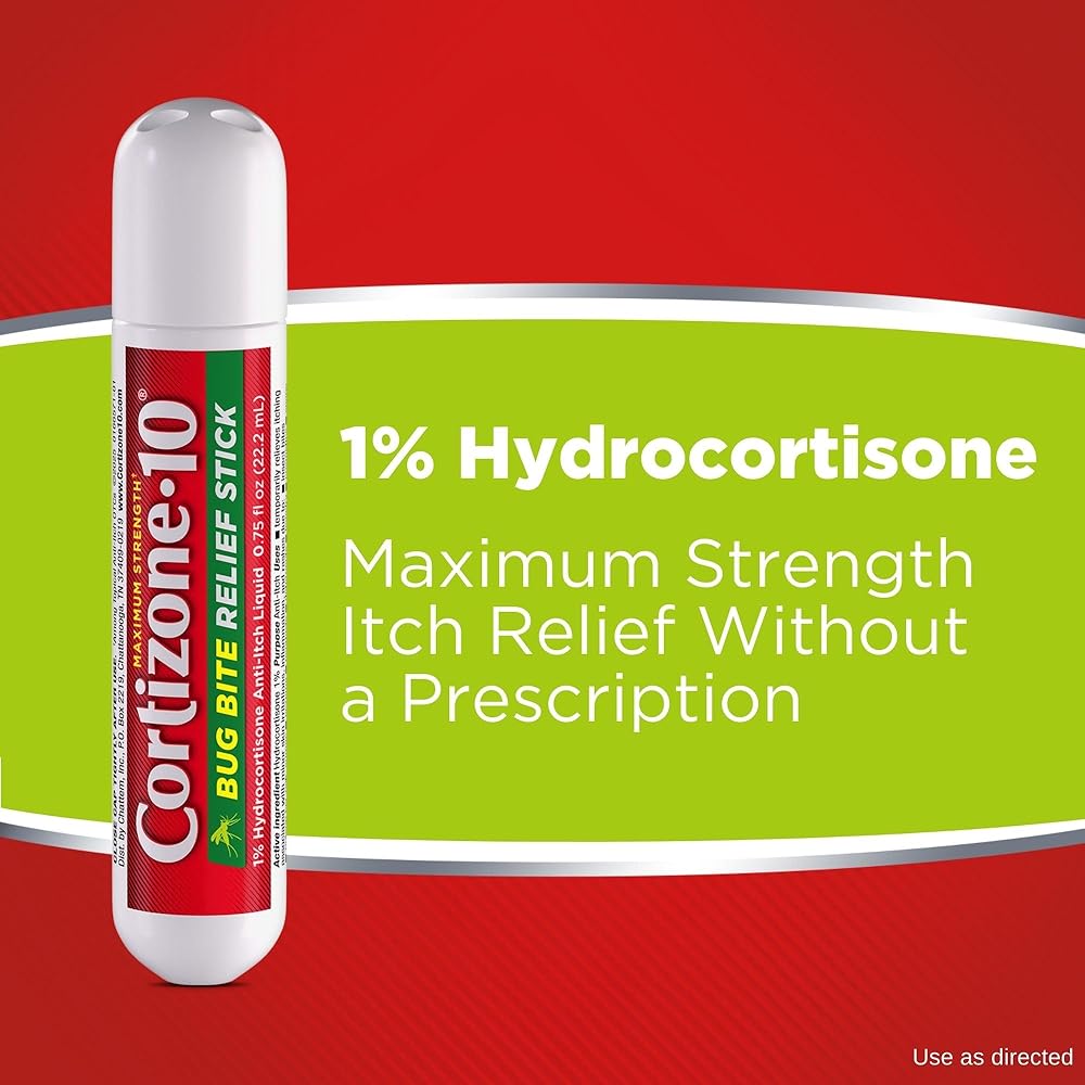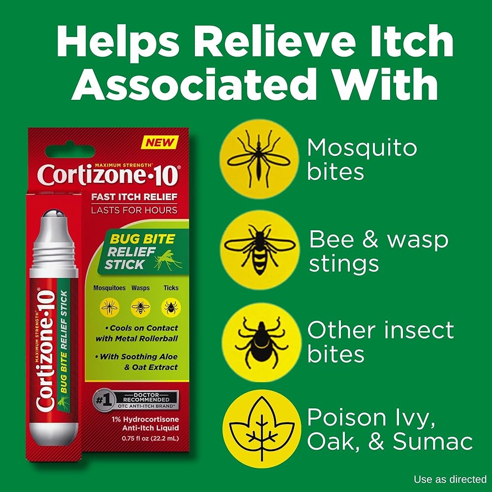 Stop the itchsanity with Cortizone-10 Maximum Strength* Itch Relief Bug Bite Stick. Formulated with 1% hydrocortisone, this anti-itch liquid starts working fast to relieve itch associated with minor skin irritations, inflammation, and rashes due to eczema, psoriasis, insect bites, detergents, jewelry, cosmetics, soaps, seborrheic dermatitis, poison ivy, oak and sumac. Cortizone-10 Itch Relief Bug Bite Relief Stick is enriched with soothing aloe and oat extract to help soothe skin and uses a no-touch metal rollerball applicator that keeps hands clean during application. It's the perfect addition to first aid kits, camping gear and travel essentials, so itching from pesky mosquito bites doesn't ruin your time outdoors. No wonder it's the No. 1 doctor-recommended OTC anti-itch brand**. *Among Topical Anti-Itch OTCs **2024 IQVIA Study