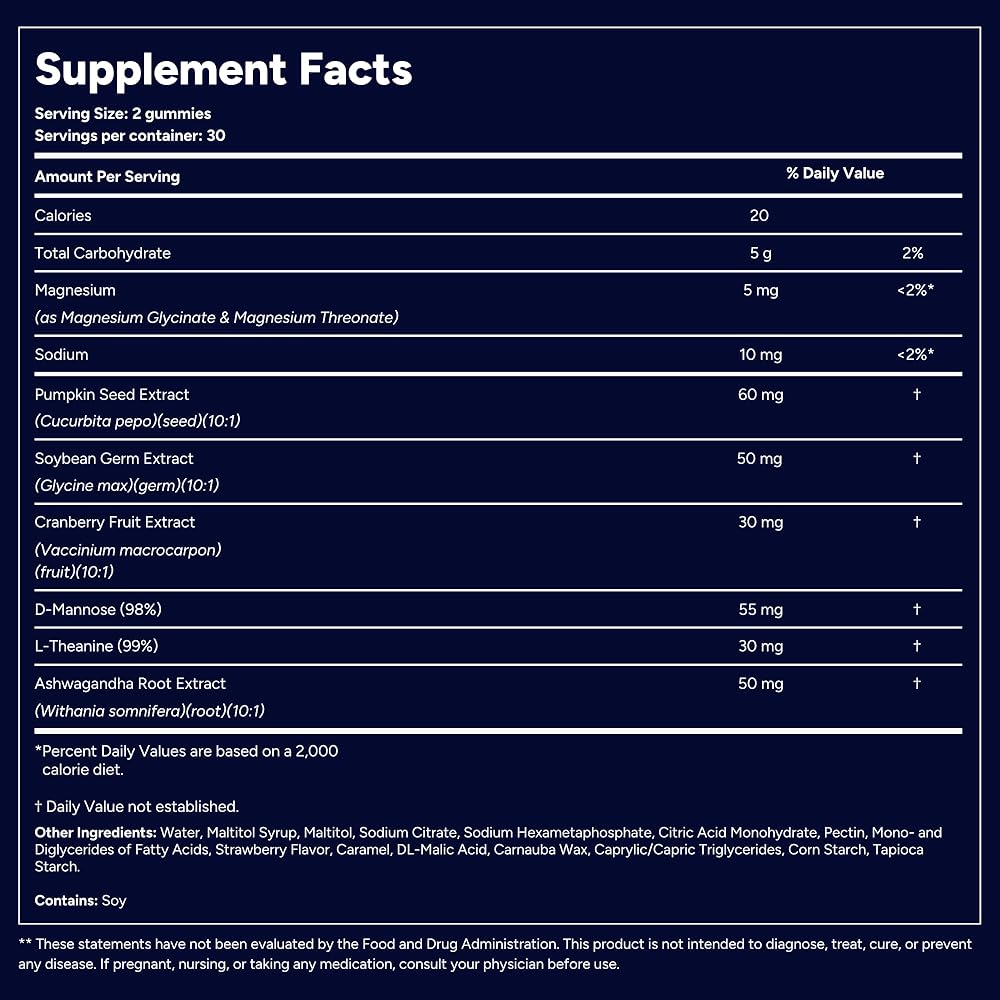 يساعد في الحفاظ على المثانة الصحية: أكثر من مجرد علاج. مع الفوائد الطبيعية لبذور اليقطين وجرثومة الصويا، تدعم هذه العلكة صحة المثانة من أجل راحة أكثر أثناء الليل. يساعد Saw Palmetto وβ-Sitosterol على تحقيق التوازن بين DHT وتعزيز الراحة البولية.