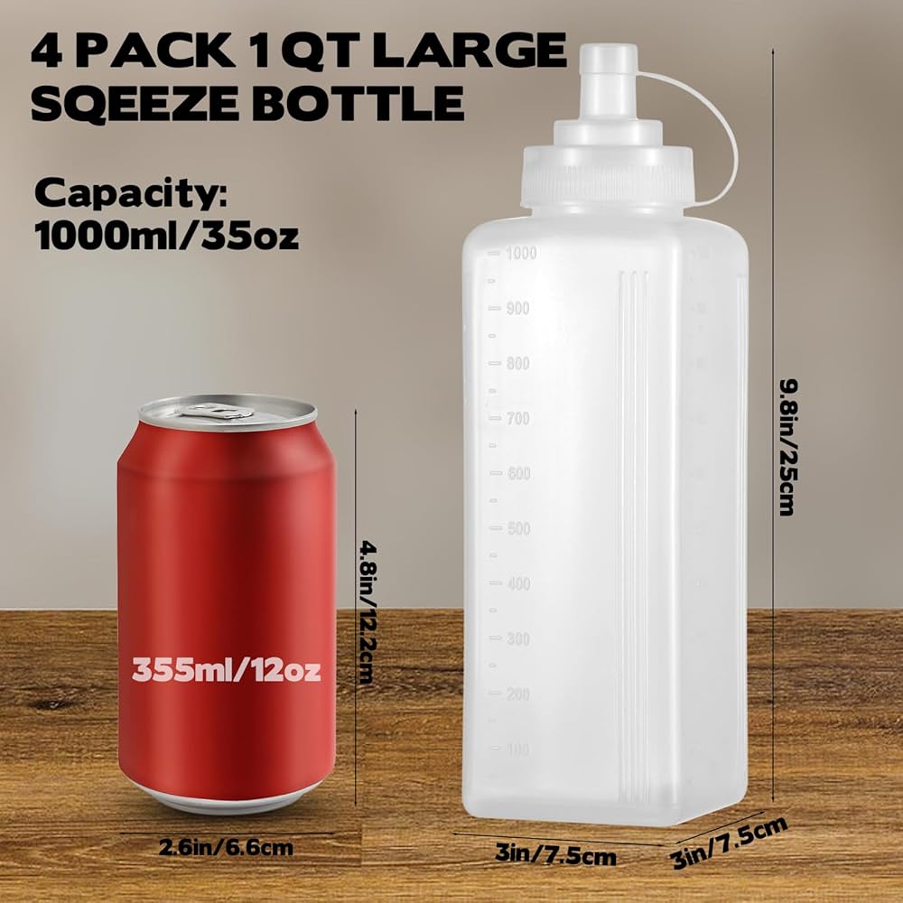 4 عبوات من زجاجات ضغط البهارات الكبيرة بحجم 1 كيو تي للصلصات، زجاجات توزيع سوائل واسعة الفم بغطاء، للكاتشب والتاكو والمارينارا والمعكرونة والشواء والإسباجيتي وصلصة الطماطم وتصميم على مستوى المطاعم