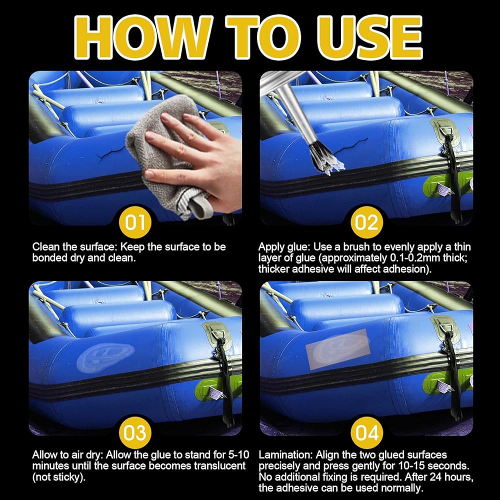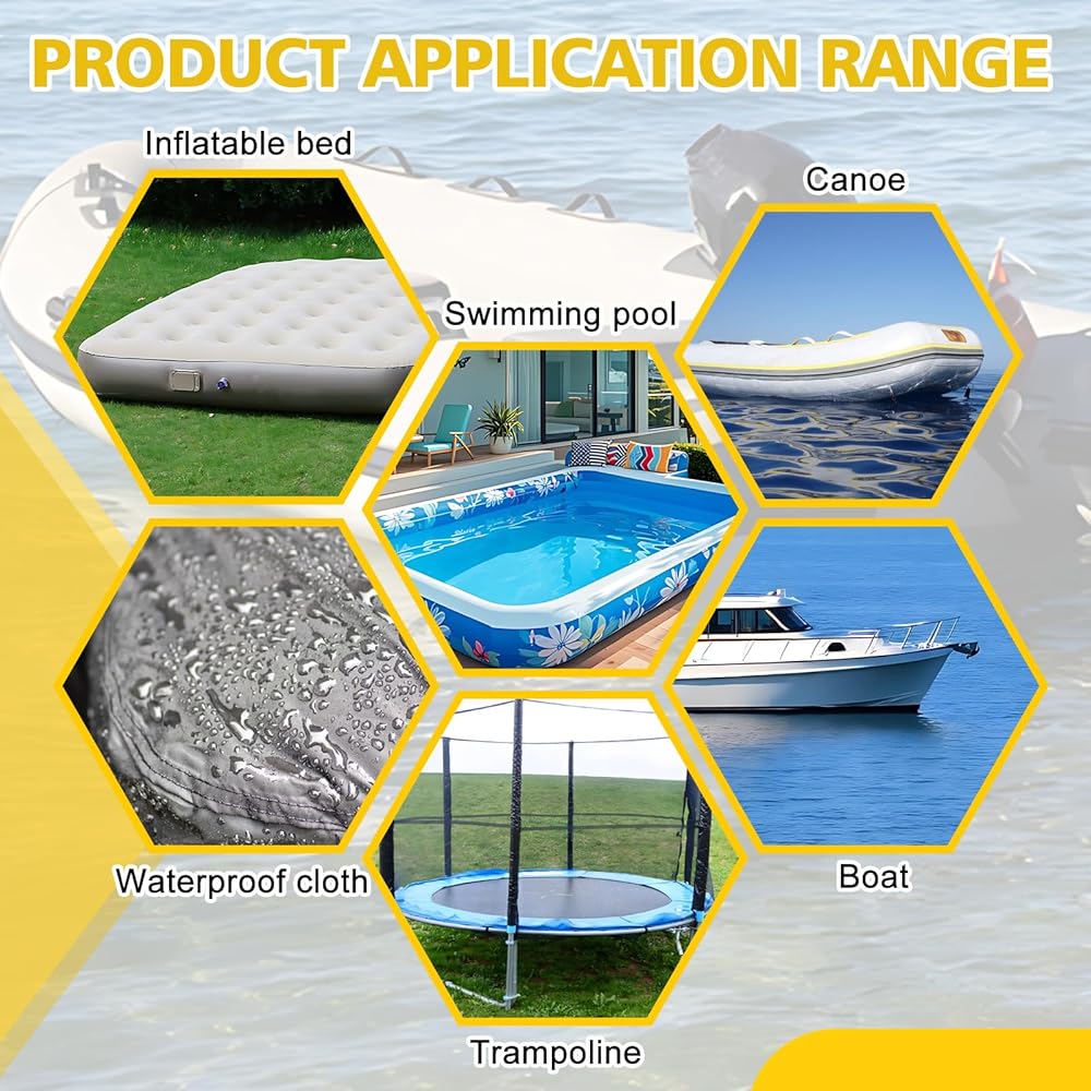 Application: suitable for bonding PP, PE, PVC, ABS, EVA and rubber. Whether for repairing air mattresses, trampolines, swimming pools, boats, tarpaulins, kayaks, etc.