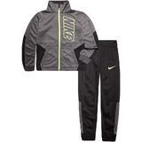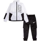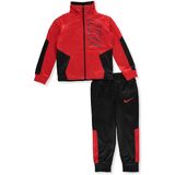 He's always in the mood to play with easy-going style in the handsome Nike Kids Color Block Full Zip Hoodie and Jogger Pants Two-Piece Track Set. This two-piece jogger set includes a jacket and a pair of pants. Color-blocked design with brandark detail throughout your little sport stands out. Standard fit jacket with stand collar, long sleeves, hand pockets and zipper closure. Elastic waistband bottoms with hand pockets and banded cuffs. 100% polyester. Machine wash, tumble dry.