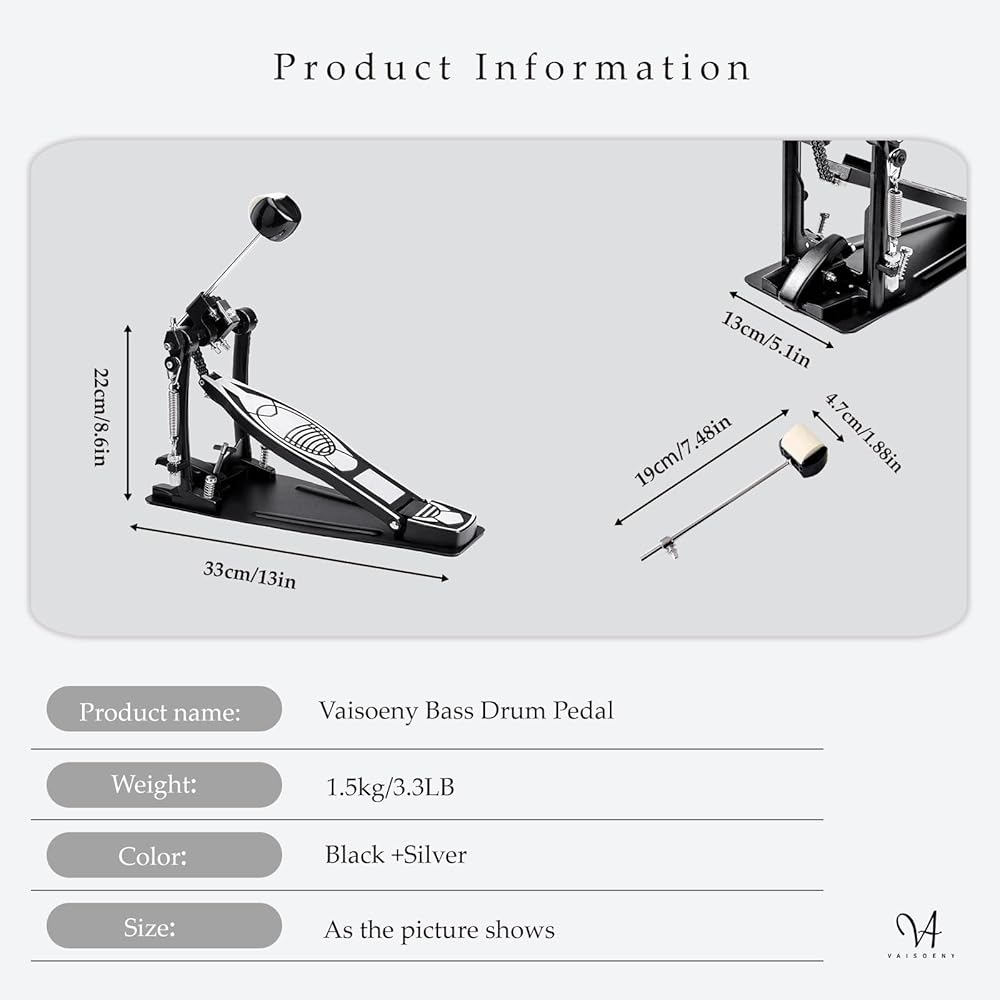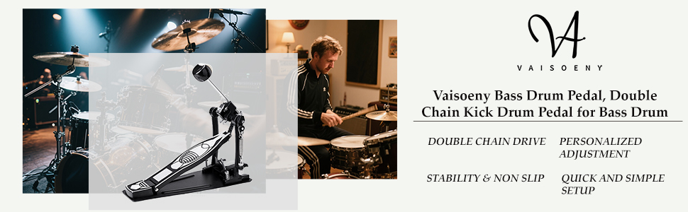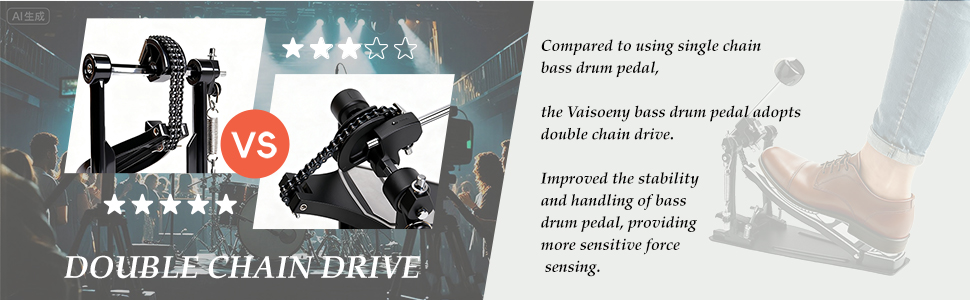 • محرك سلسلة مزدوجة - بالمقارنة مع استخدام دواسة طبلة الجهير ذات سلسلة واحدة، فإن دواسة طبلة الجهير Vaisoeny تستخدم محرك سلسلة مزدوجة. تم تحسين الثبات والتعامل مع دواسة طبلة الجهير، مما يوفر استشعارًا أكثر حساسية للقوة.