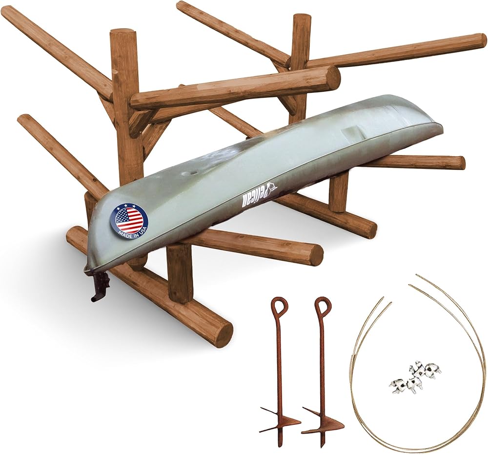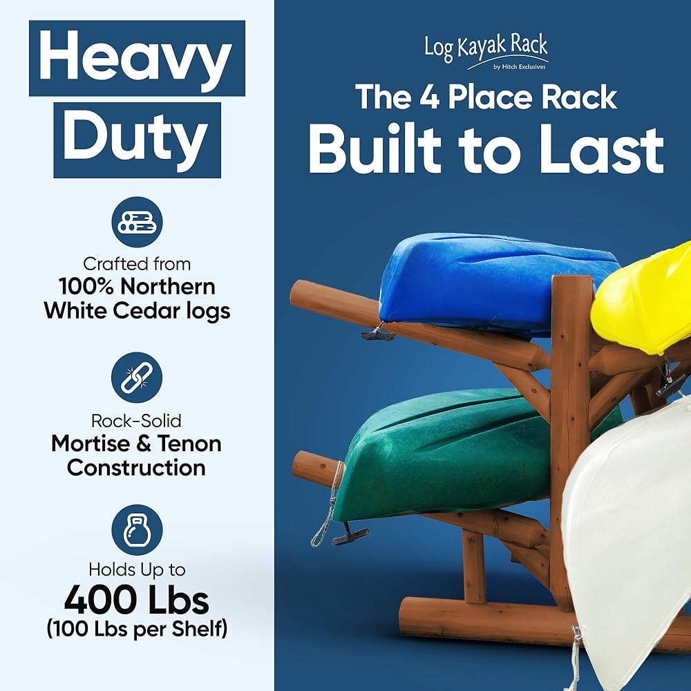 • PREMIUM CRAFTSMANSHIP: Crafted with 100% Northern White Cedar from Michigan's Upper Peninsula, this freestanding kayak rack is both functional and visually appealing. Handcrafted by skilled artisans in Northern Wisconsin, each joint is meticulously glued and screwed using mortise and tenon joinery for enhanced durability. With a capacity to hold up to 4 watercrafts, including canoes, surfboards, kayaks, & SUPs, each slot can support up to 100 pounds, totaling an impressive 600 pounds overall.