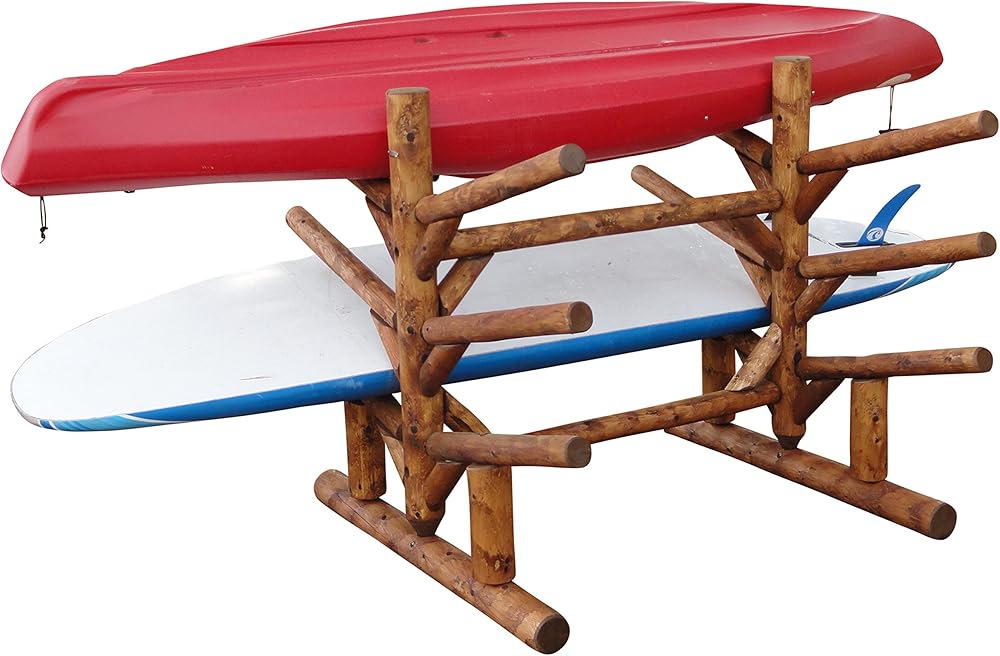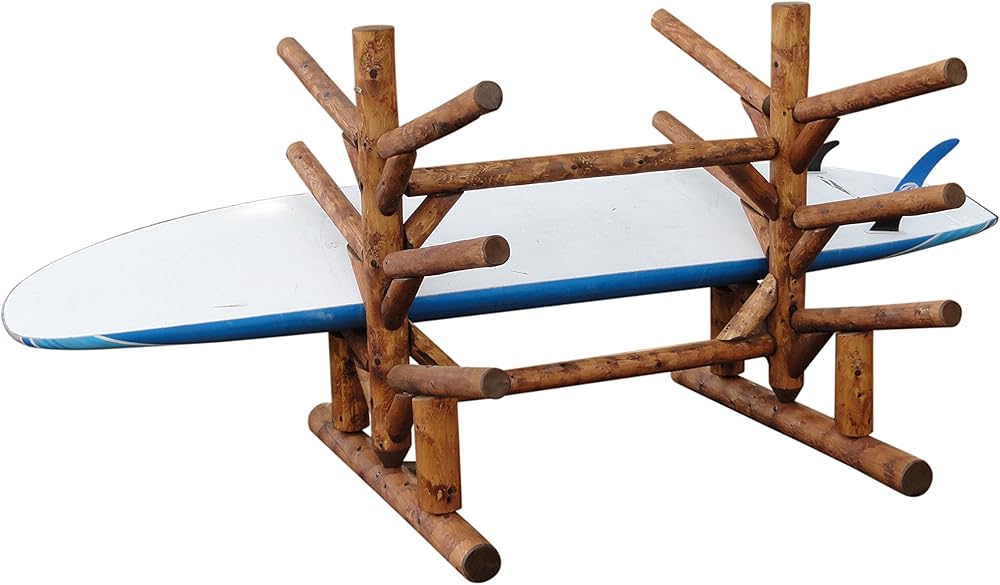• COMPACT AND STURDY DESIGN: This paddle board storage rack measures 50"H x 60"D x 53"W, offering a space-saving solution for any setup. Its log-construction aesthetic complements lakefront homes or garages, making our paddle board racks garage and surfboard racks for garage both functional and visually appealing. This SUP rack is engineered for durability, ensuring long-lasting use in any environment.
