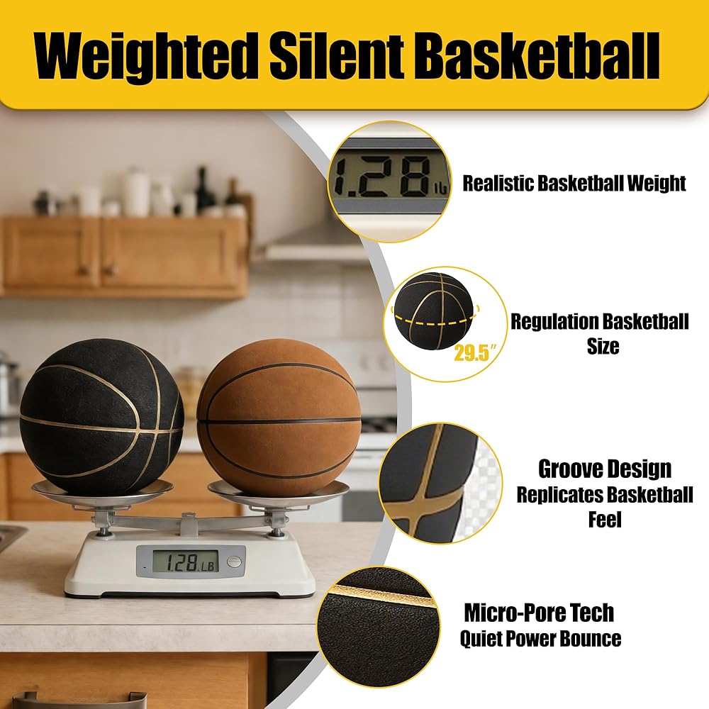 مقاس 7 (29.5 بوصة) كرة سلة صامتة رسمية ذات أخاديد مرجحة، شحن غير مضغوط، رغوة PU احترافية، مثالية للمراوغة الصامتة في الداخل والخارج (1.28 رطل، أسود)