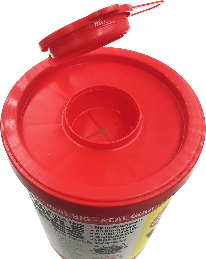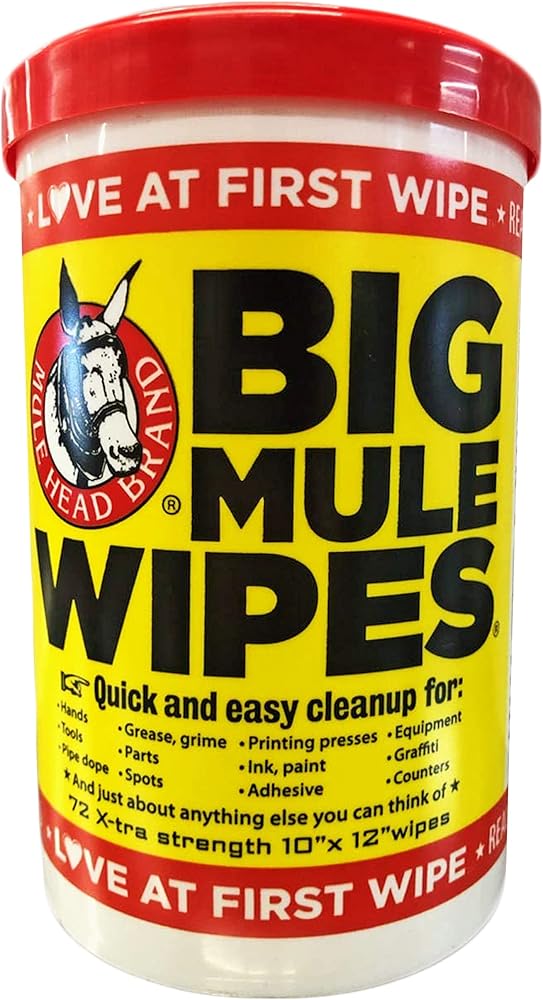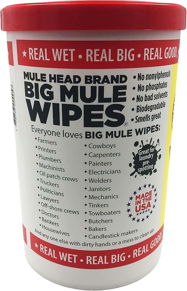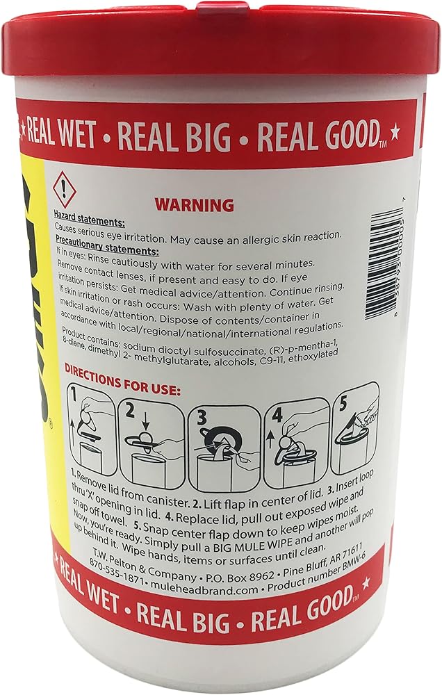 72 WIPES Big Mule Wipes ***Quick and Easy cleanup for: *Hands *Tools *Pipe Dope *Grease, grime *Parts *Spots * Printing Presses *Ink, Pain *Adhesive *Equipment *Graffiti *Counters ****AND just about anything you can think of *****. EVERYONE LOVES BIG MULE WIPES: Farmers *Doctors * Welders *Printers * Bankers *Janitors *Plumbers *Housewives *Mechanics *Machinists *Cowboys *Tinkers *Truckers *Off Shore Crews *Tow boaters *Politicians *Butchers *Oil Patch crews *Carpenters *Bakers *Lawyers *Electricians *Candlestick Makers ***And anyone else with a mess to clean up. HAZARD STATEMENTS: CAUSES SERIOUS EYE IRRITATION. MAY CAUSE AN ALLERGIC REACTION. Precautionary Statements: If in eyes: Rinse cautiously with water for several minutes. Remove contact lenses, if present and easy to do. If eye irritation persists: Get medical advice/attention. Continue rinsing if skin irritation or rash occurs. Wash with plenty of water. Get medical advice/attention. Dispose of contents/container in accordance with local/regional/national/international regulations. Product contains sodium dioctyl sulfosuccinate, (R)-p-mentha-1, 8-diene, dimethyl 2- methylglutarate, alcohols, C9-11, etoxylated Directions for use: 1) Remove Lid from canister. 2) Lift Flap in center of lid. 3) Insert loop thru "X" opening in Lid. 4) Replace lid, pul out exposed wipe's and snap of towel. 5) Snap center flap down to keep wipes moist. Now you're ready. Simply pull a BIG MULE WIPE and another will pop up behind it. Wipe hands, items or surface until clean. *******MADE IN THE USA******* ***** Great For Laundry Pre-Spotting*******.