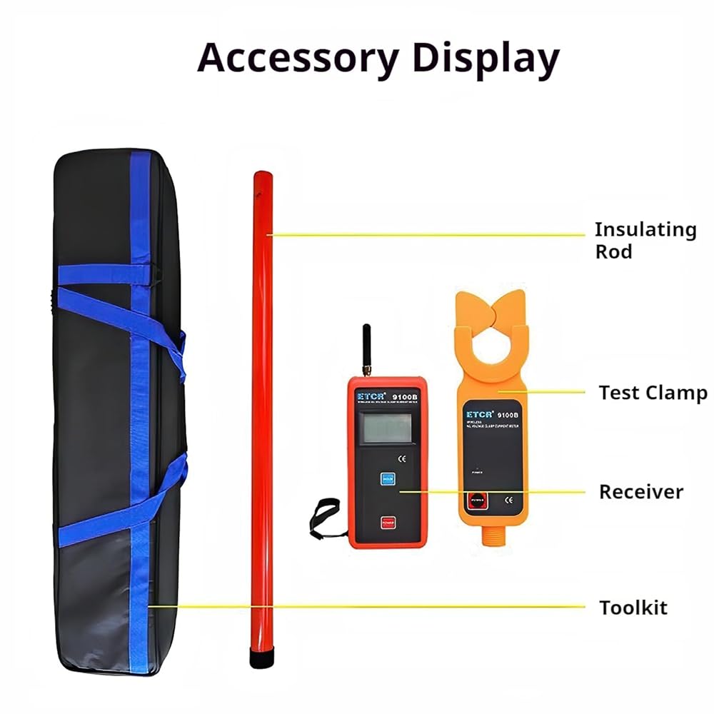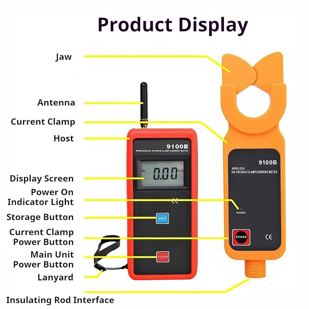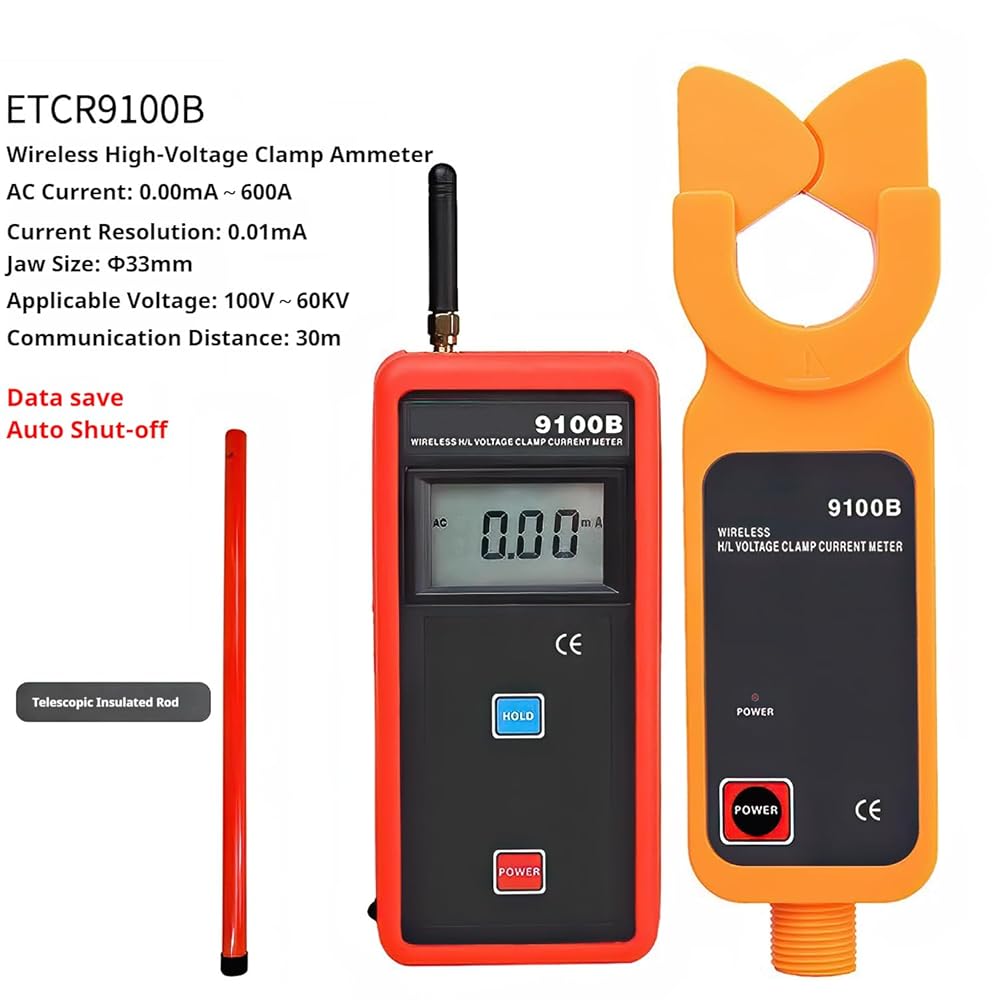 9100B high and low voltage clamp ammeter for low voltage leakage current and current measurement up to 60kV. Range: 0.00mA~600A, jaw size is Φ33mm, special alloy for current clamp, magnetic shield technology, strong anti-interference ability, ensure Measurement accuracy and stability.