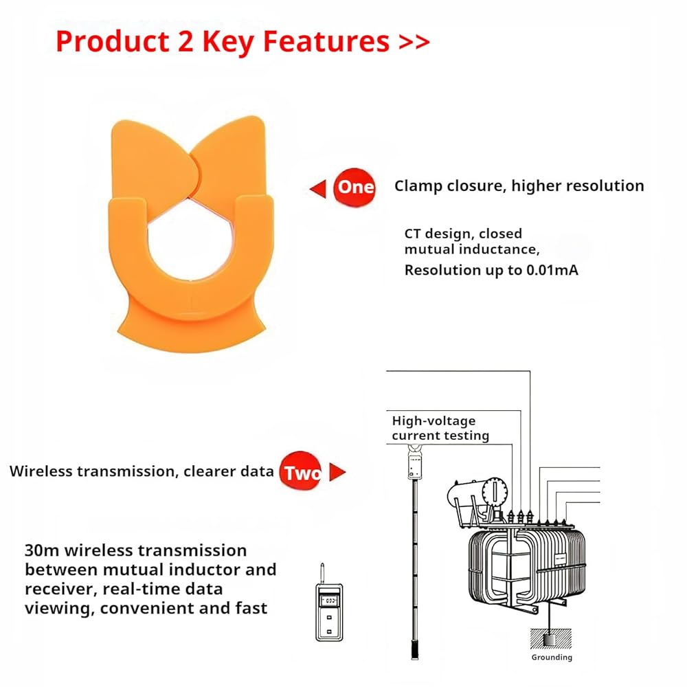 Resolution: 0.01mA; Accuracy: ±1%rdg±5dgt (23°C±5°C, 80%r or less); The ammeter consists of a high-voltage detector, a wireless receiver, and five high voltage insulation rods. The insulation rods are light, with features such as moisture resistance, high temperature resistance, impact resistance, bending resistance, high insulation, and detachability.