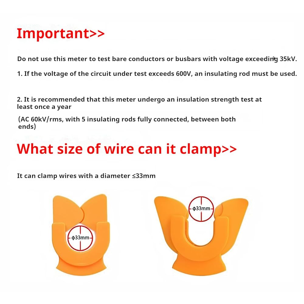 * Clamp meter size:Host:245mmX68mmX40mm; Receiver:170mm x 75mm x 30mm