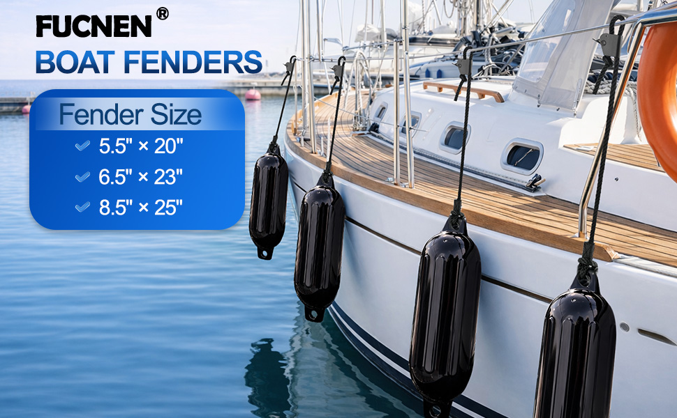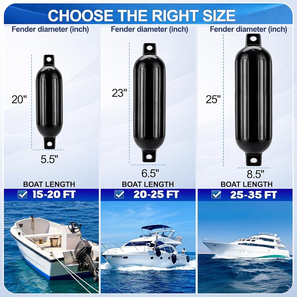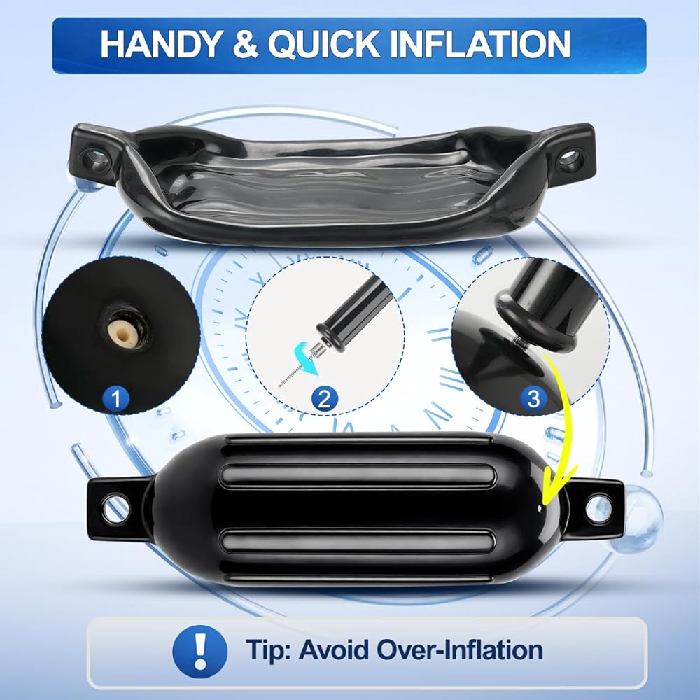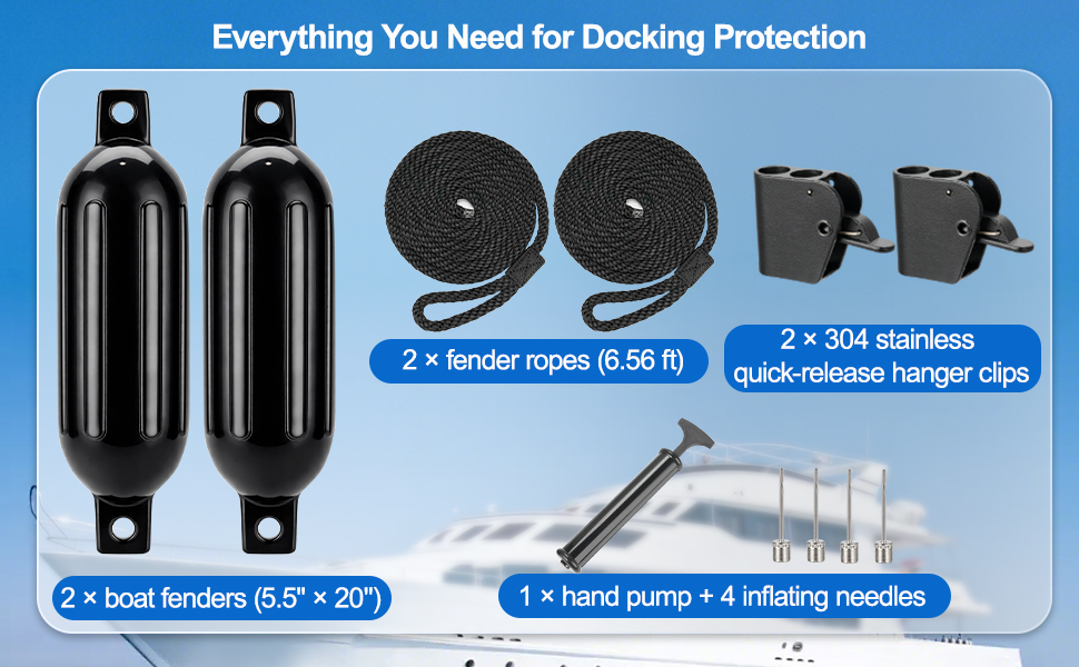 Complete Docking Fender Kit : 2-pack boat fenders (5.5" x 20") + hand pump w/ 4 inflating needles + 4 fender ropes (6.56 ft) + 4 304 stainless hanger clips—everything you need for boat fenders for docking