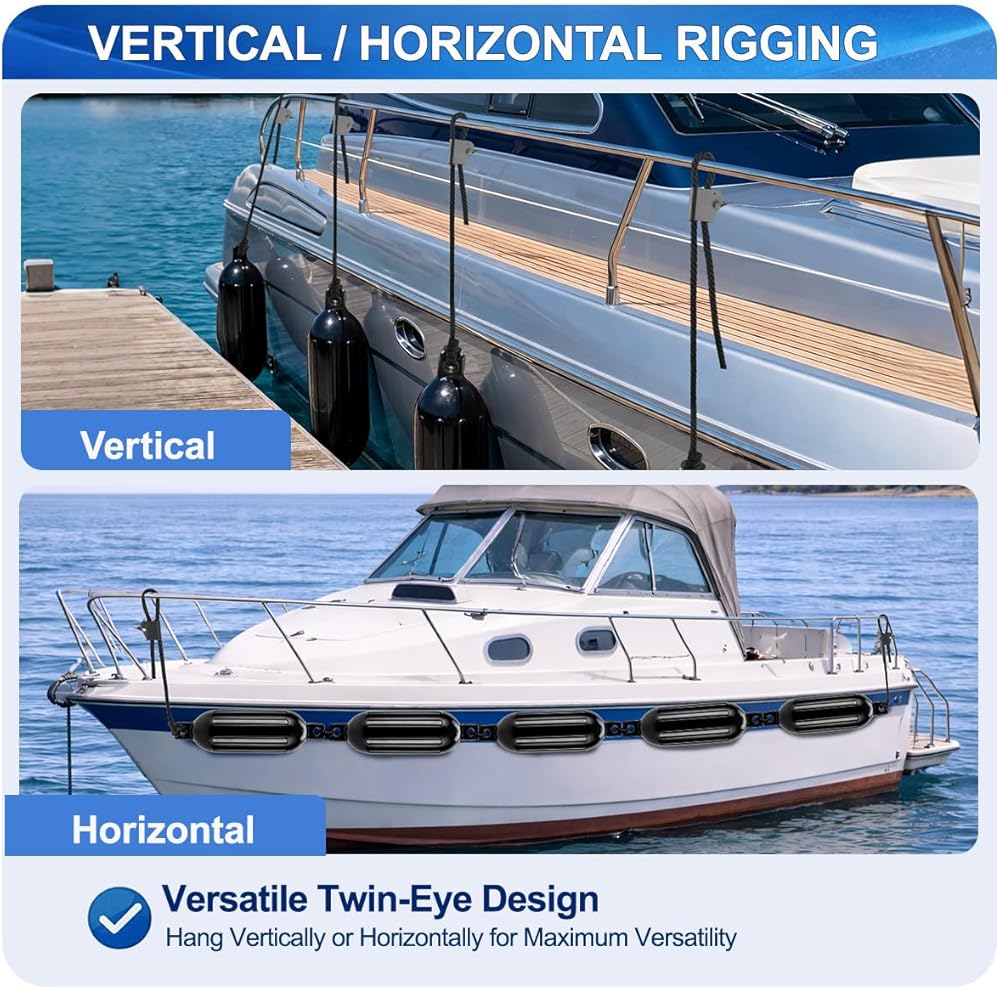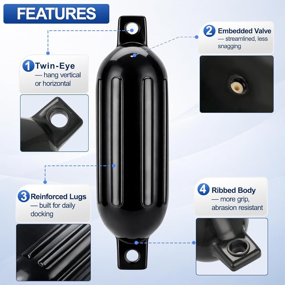 Smart Valve + Heavy-Duty Twin Eyes: Embedded valve helps prevent valve lug loss; one-piece reinforced lugs last longer; 4-sided ribs boost friction and abrasion resistance; dual-eye design lets you hang your boat fender vertically or horizontally as dock fenders / dock fender