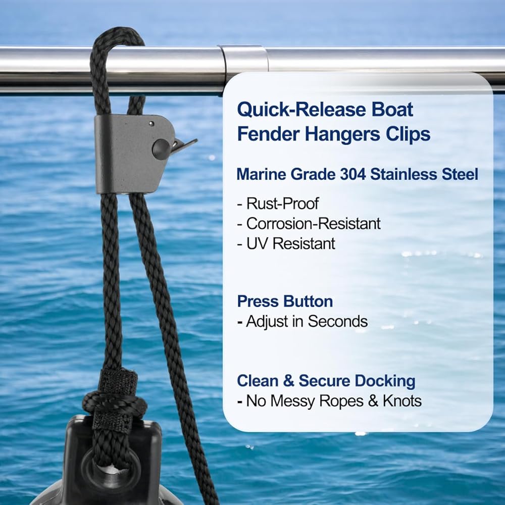 Quick-Adjust Hanger Clips—No Knots, No Hassle: 304 stainless boat fender hanger clips with spring-button quick release let you extend/retract rope in seconds—easy height adjustments on pontoon rails or boat rails for pontoon boat fenders and everyday boat bumpers for docking