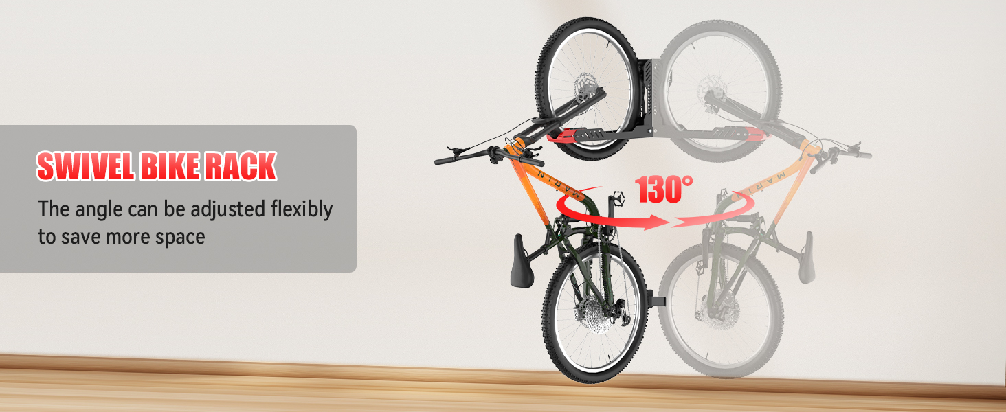 • 【تصميم دوار وتوفير المساحة】يستخدم حامل الدراجة الدوارة ±65 درجة مساحة الأرضية والجدار بكفاءة. ببساطة قم بتدويرها لضبط الوضع، مما يجعلها مثالية للشقق والغرف الصغيرة وتنظيم جراج الدراجات