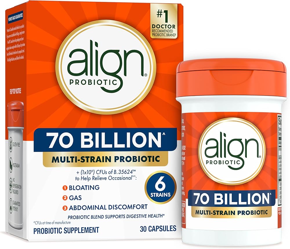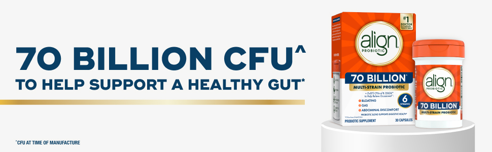 • HELPS RELIEVE OCCASIONAL BLOATING: Align 70 Billion is a high CFU probiotic for digestive health that is formulated with Probiotic 35624TM to help relieve occasional bloating, gas, and abdominal discomfort.
