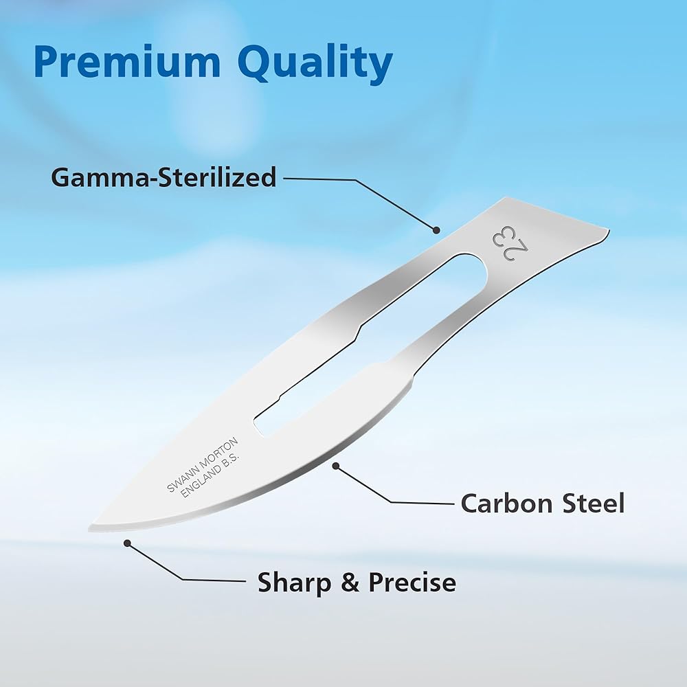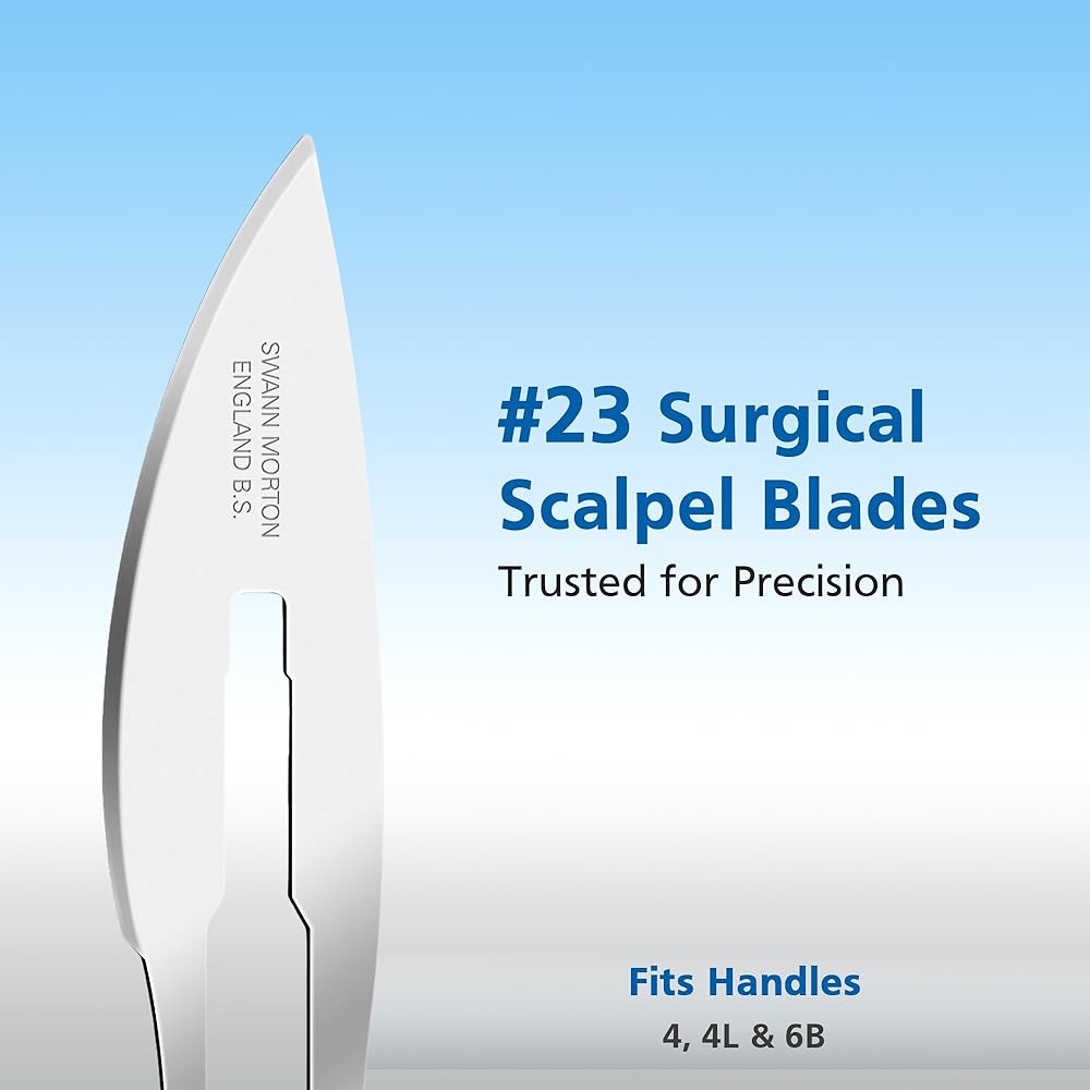 شفرة مشرط جراحي من سوان مورتون #23 - أدوات احترافية للجراحين، معقمة للاستخدام الطبي، فولاذ كربوني - مغلفة بشكل فردي، صندوق مكون من 100 قطعة