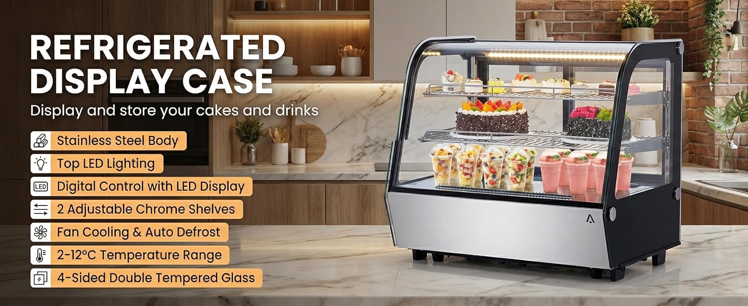 【زجاج مقسى من أربعة جوانب】 يوفر الزجاج المقسى ذو الطبقة المزدوجة على الجوانب الأربعة عزلًا فائقًا ورؤية واضحة تمامًا. يعمل التصميم المعزول على تقليل التكثيف للحصول على مناظر خالية من العوائق، بحيث يمكن للعملاء رؤية المعجنات والمشروبات والحلويات المبردة من أي زاوية. زجاج الأمان المتين يعزز تأثير العرض والترويج.