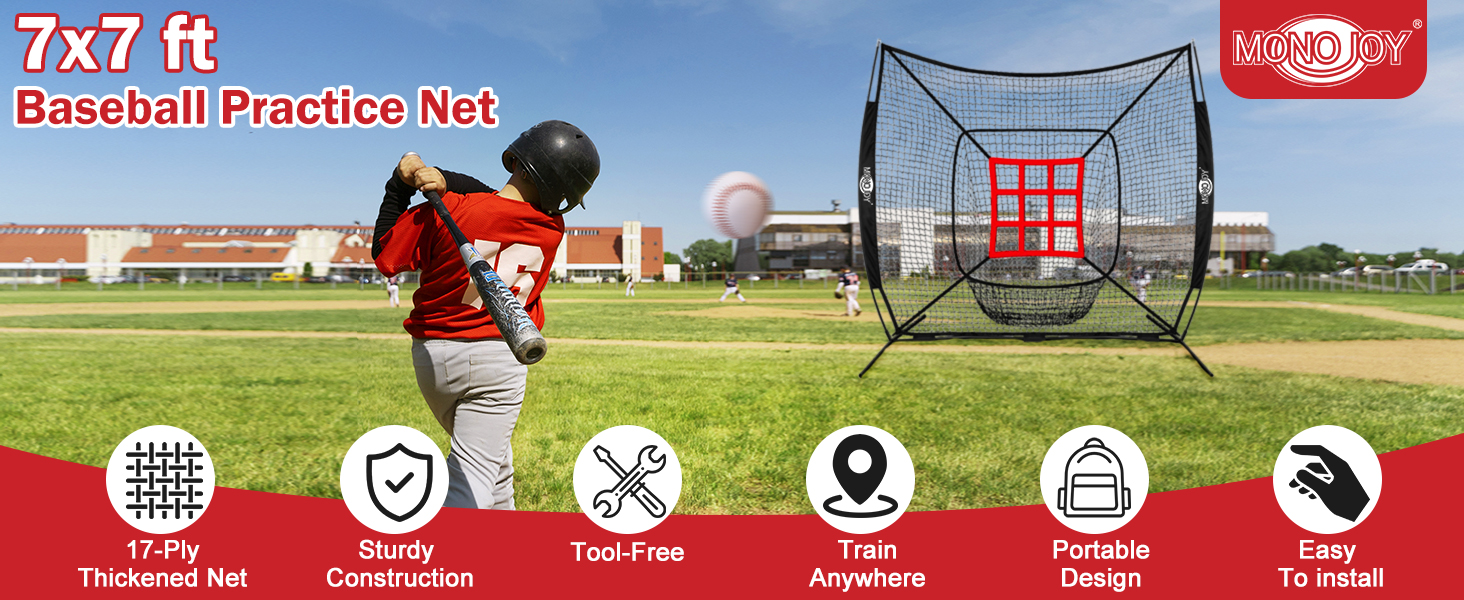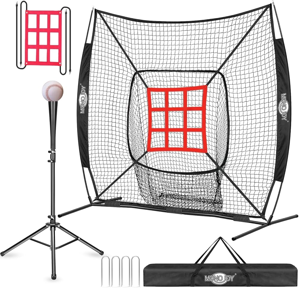 شبكة تدريب البيسبول مقاس 7x7 أقدام من MONOJOY للضرب والرمي، شبكة تدريب مع منطقة ضربة كبيرة أو تي شيرت وهدف 9 جيوب، شبكة كرة لينة شديدة التحمل مع حقيبة حمل للفناء الخلفي، للاستخدام الداخلي والخارجي