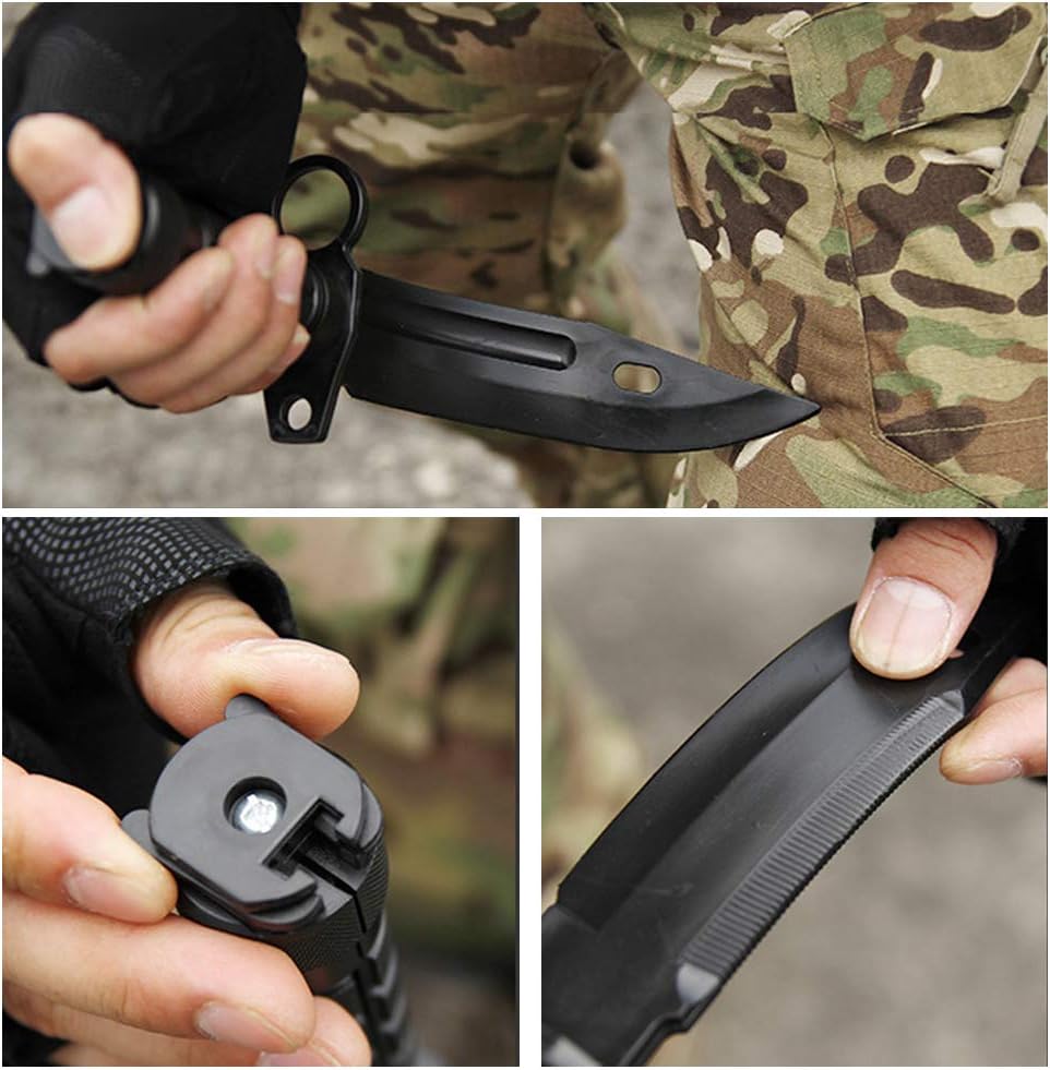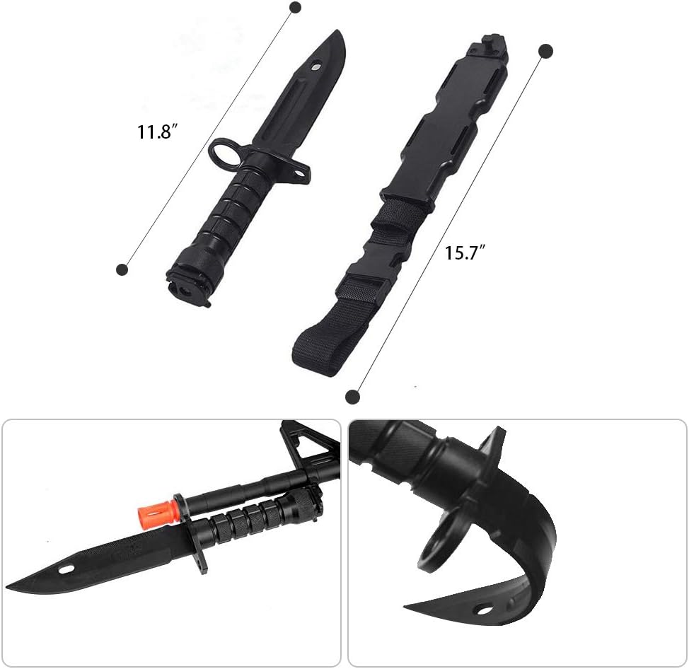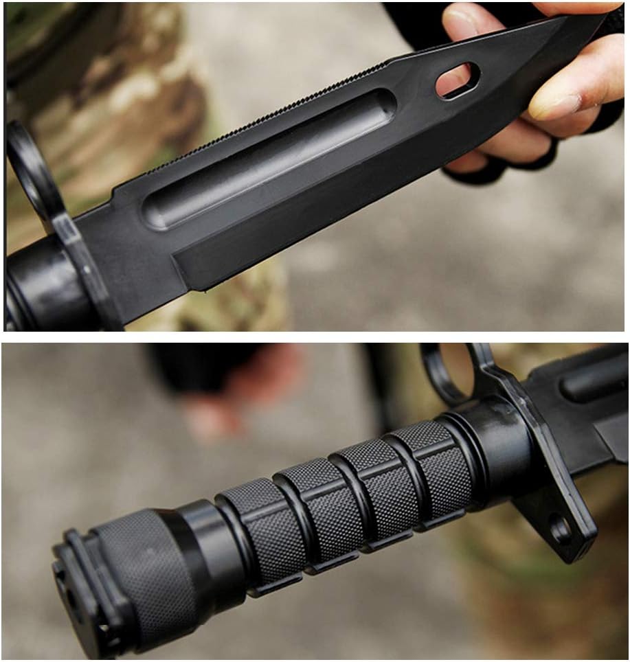 ☛【سهلة الحمل】: هيكل من النايلون عالي الكثافة، قادر على التعليق على حزام الخصر، سهل الاستخدام، يسلط الضوء على مهارتك! تأتي مع دمية بلاستيكية Airsoft M9 M16 حربة مع غمد، مقبض BS مضاد للانزلاق، مريح للاستخدام الخاص بك