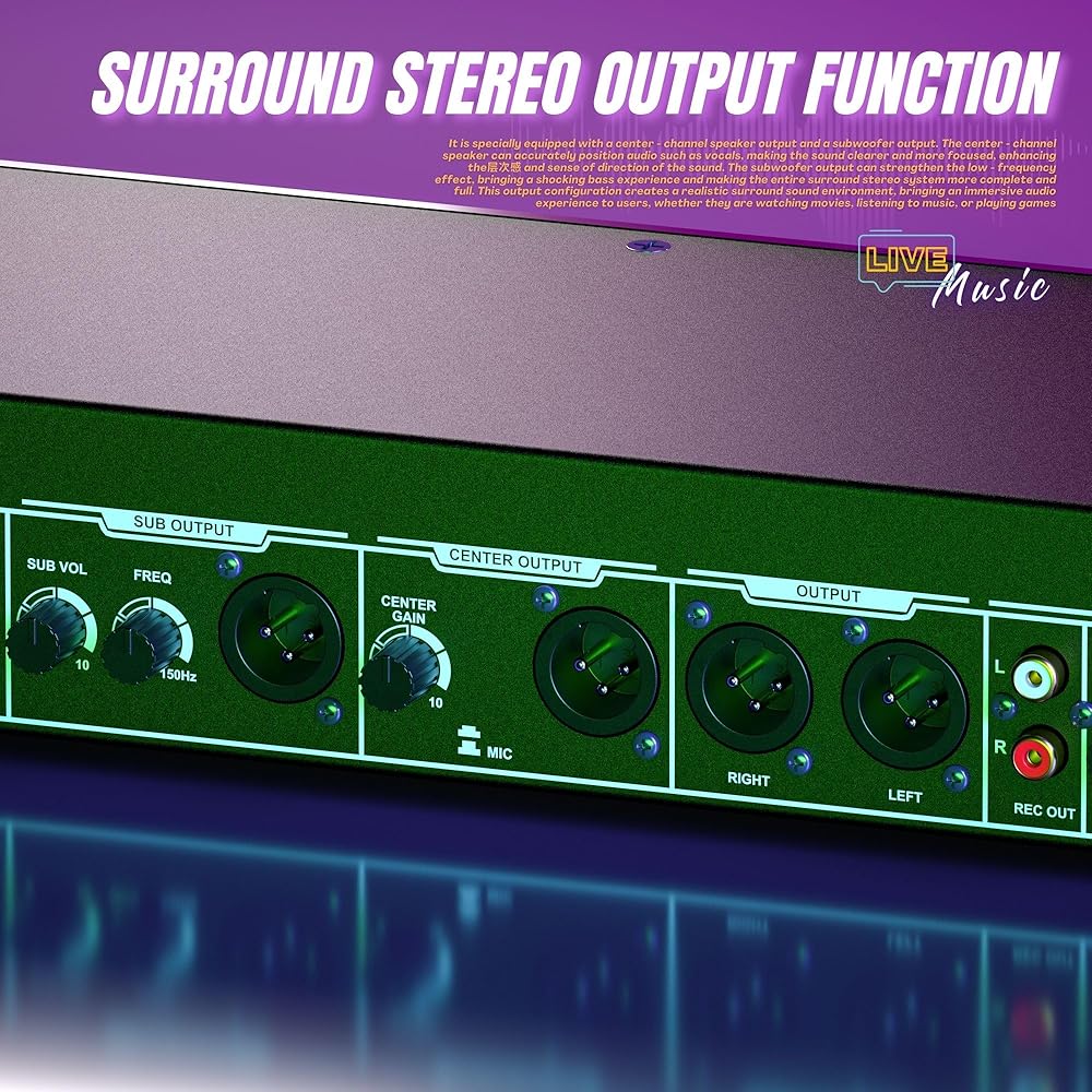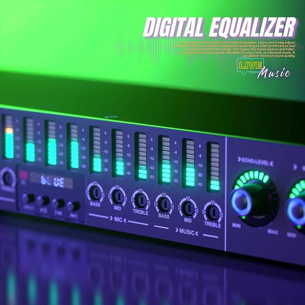 Preamp Reverberation Effector: Digital Stereo Equalizer is equipped with a professional pre-effects processor, providing real-time feedback and precise control over sound effects, perfect for achieving a complete stereo feeling with bass, center, left, and right channel modes