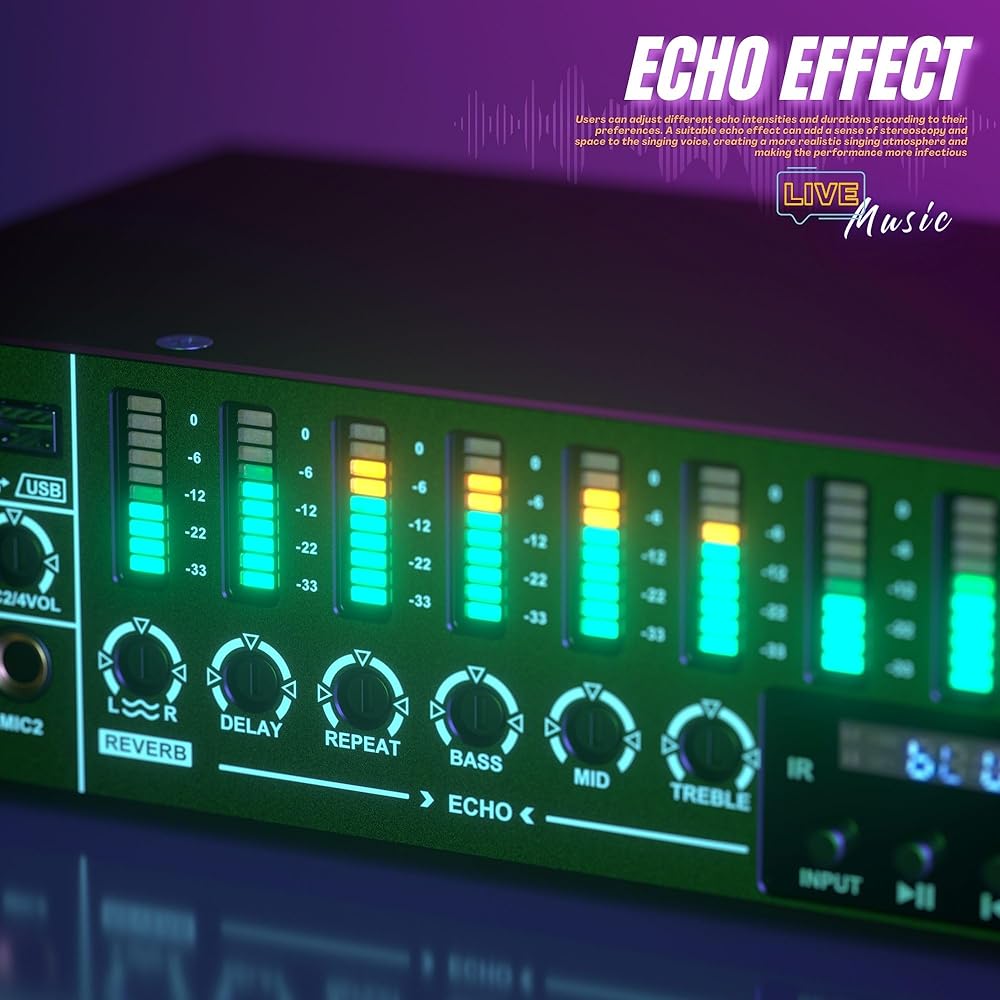 Precise Audio adjustments: Audio Processor features sensitive knobs and time delay/repeat/treble/alto/bass adjustment functions, allowing easy attainment of professional audio levels, coming with a remote control (battery NOT included) for effortless fine-tuning from a distance