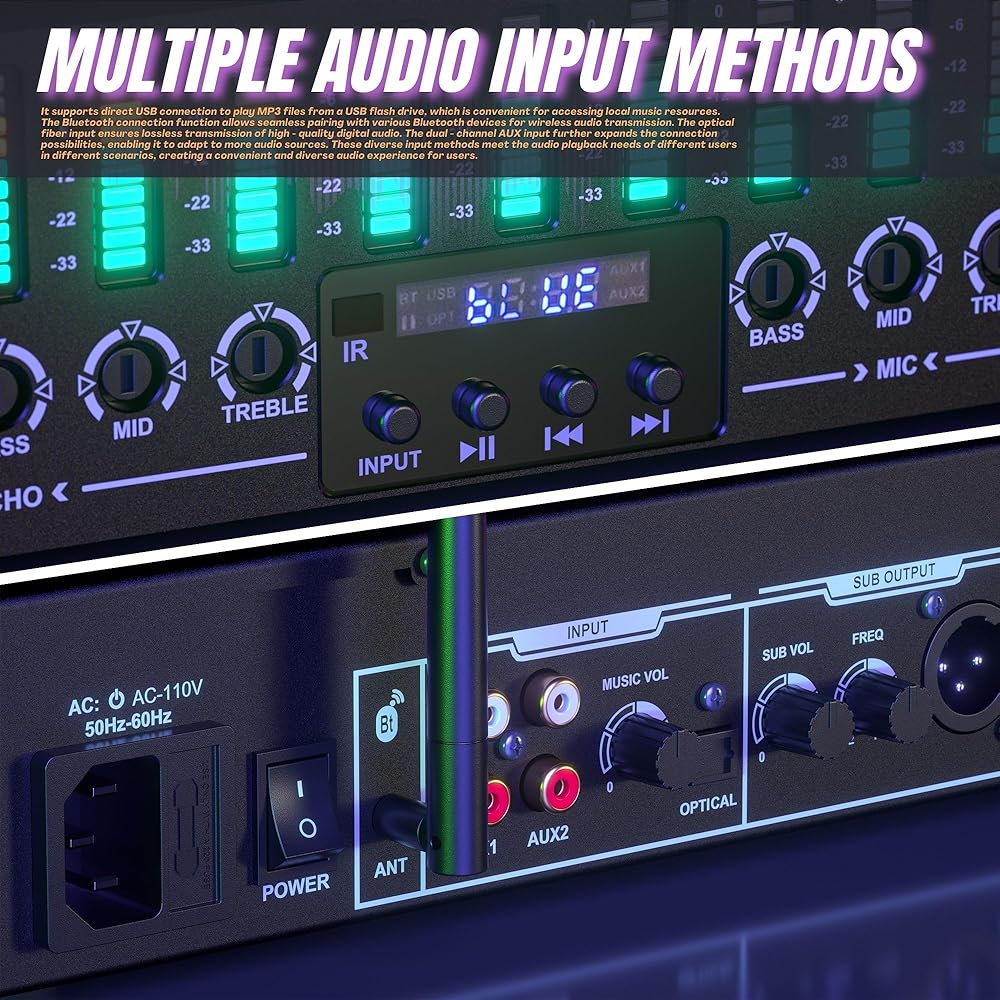 Versatile Connectivity: Pre-Stage Effector supports 5-way input including audio, AUX, optical fiber, USB, and Bluetooth (Approx. 50ft). Easily switch between audio sources with the INPUT key. Including subwoofer output and XLR output ports for comprehensive connectivity