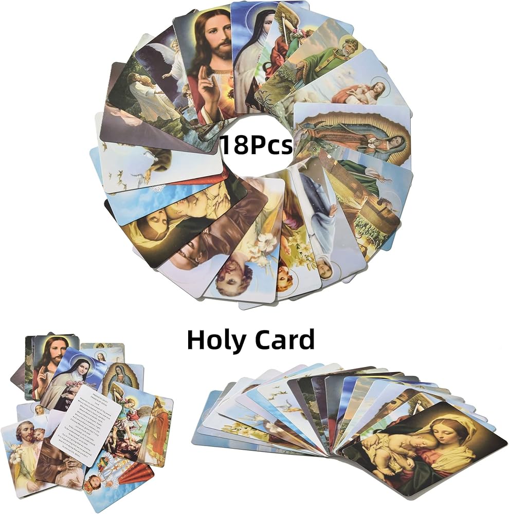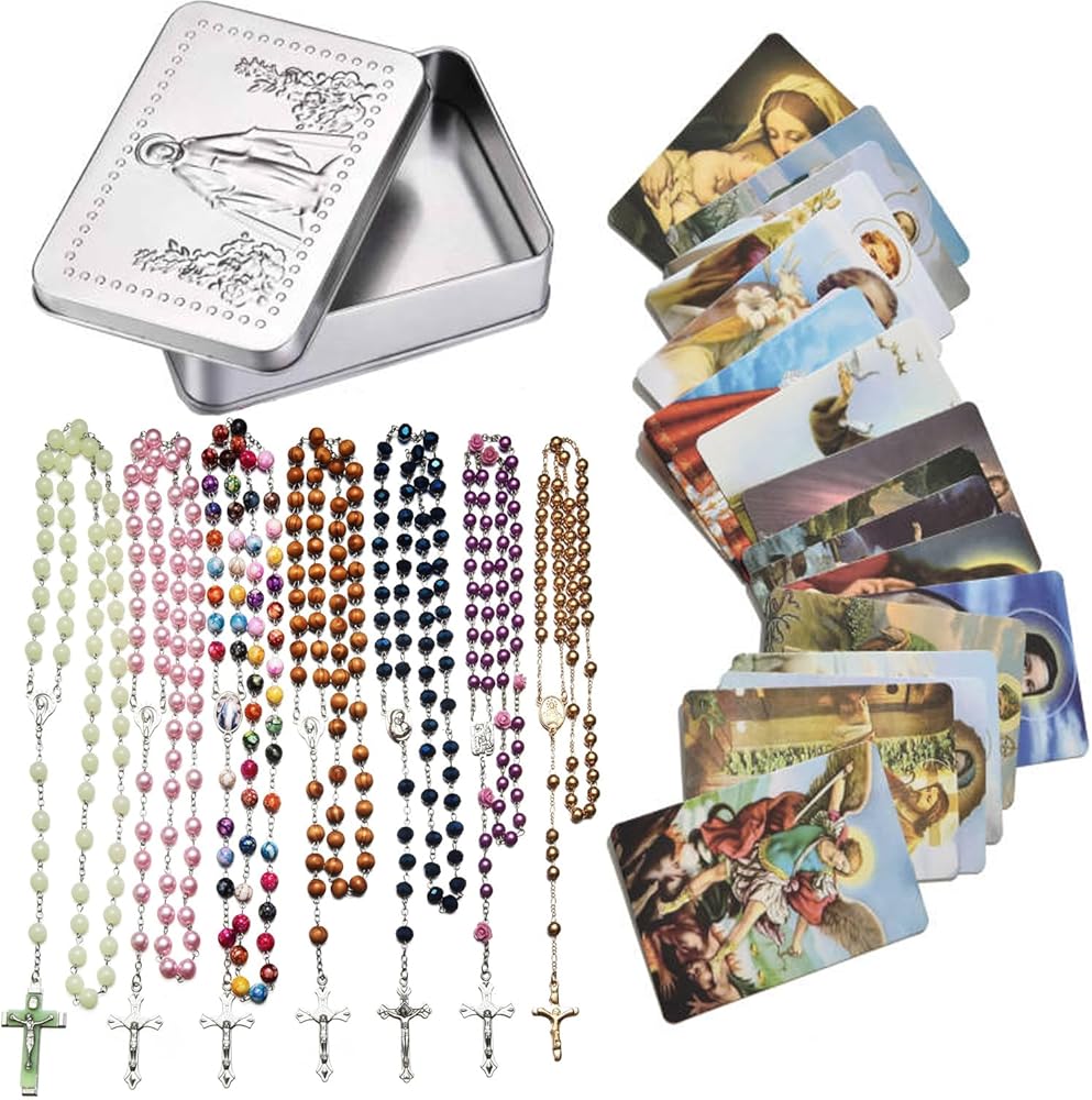 7 قطع من حبات المسبحة الوردية وقلادة كاثوليكية و18 قطعة من البطاقة المقدسة، هدايا المناولة الأولى الكاثوليكية، ميدالية ورد لورد والصليب