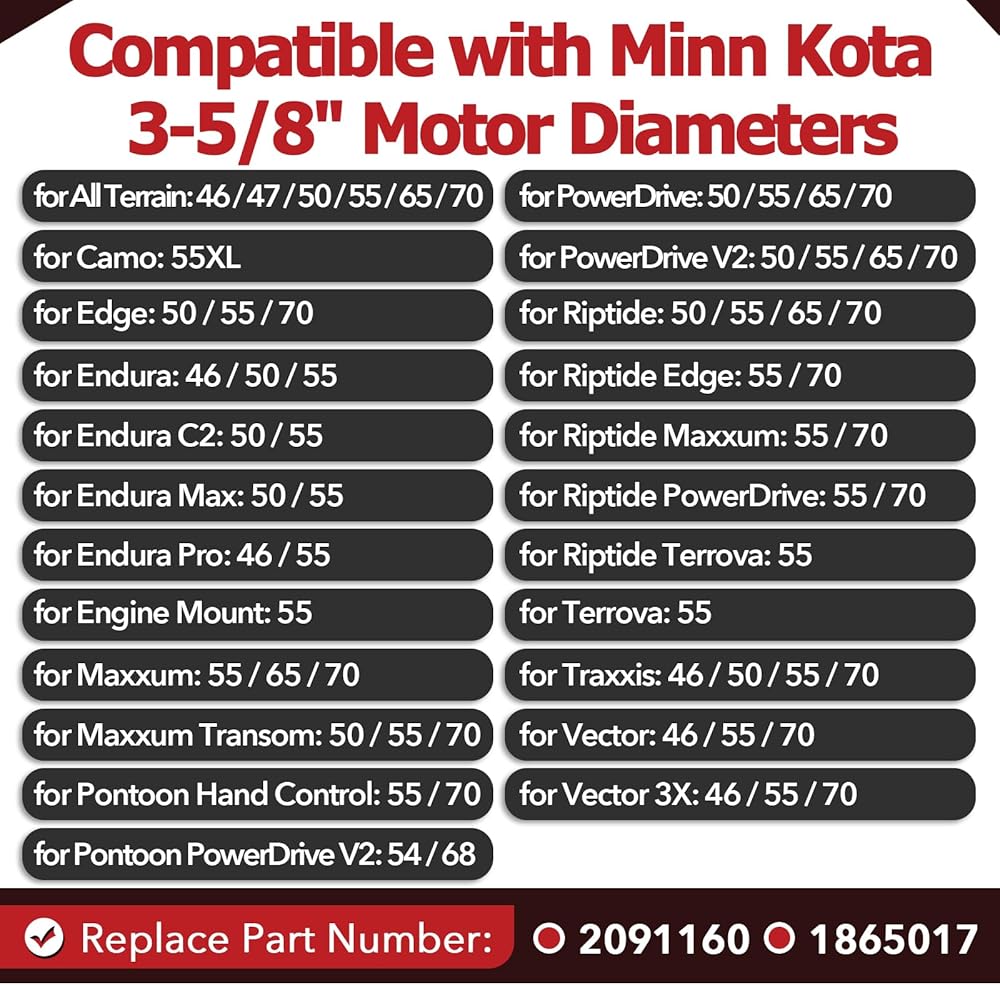 Wide Compatibility: Designed for Minn Kota trolling motors with a 3-5/8" diameter. Compatible with multiple Minn Kota motor series including All Terrain (46/47/50/55/65/70), Edge (50/55/70), Endura (46/50/55), Endura C2 (50/55), Endura Max (50/55), Endura Pro (46/55), Camo 55XL, Engine Mount 55, Maxxum (55/65/70), Maxxum Transom (50/55/70), Pontoon Hand Control (55/70), Pontoon PowerDrive V2 (54/68), as well as PowerDrive, PowerDrive V2, Riptide, Riptide Edge, Riptide Maxxum, Riptide PowerDrive, Riptide Terrova, Terrova, Traxxis, Vector and Vector 3X models