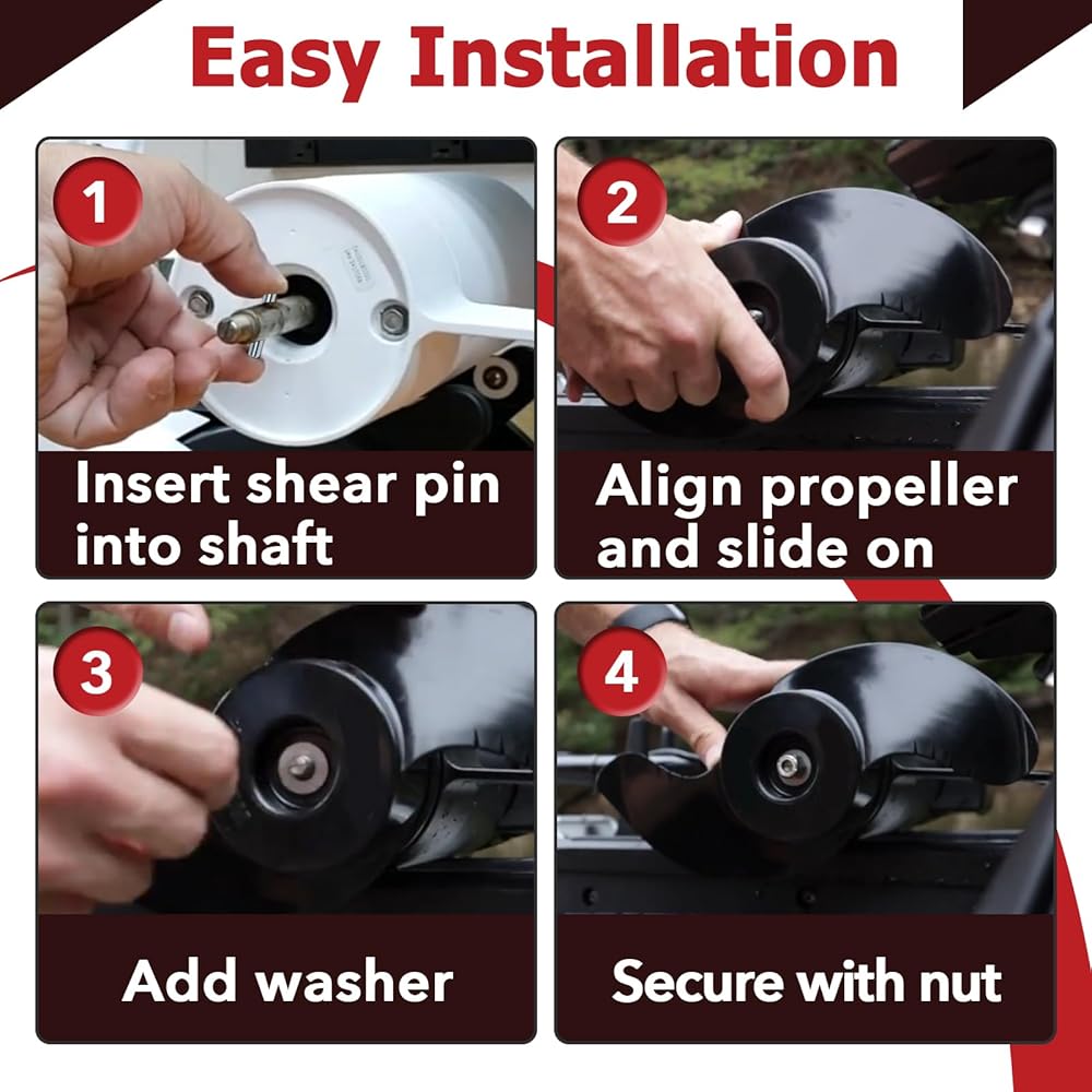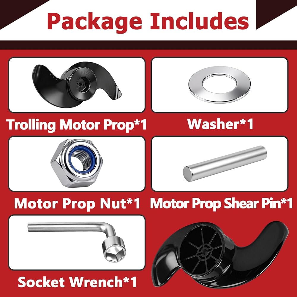 You Will Receive: 1 set MKP-32 trolling motor propeller kit including: 1 trolling motor prop, 1 shear pin, 1 support nut, 1 washer and 1 socket wrench for easy installation