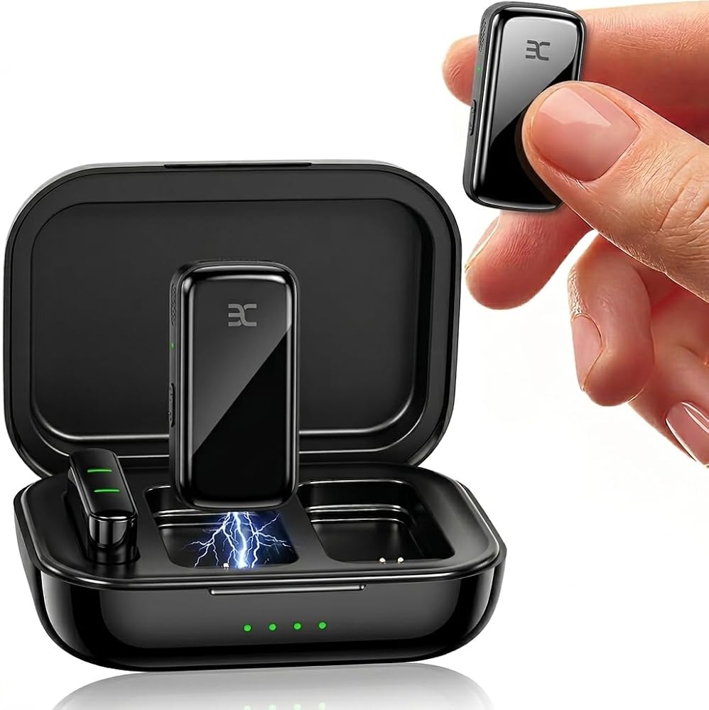 نظام ميكروفون لاسلكي EX، ميكروفونات مزدوجة + حافظة شحن، نطاق توصيل وتشغيل يصل إلى 164 قدمًا لأجهزة iPhone/Android، تقليل الضوضاء المتقدم، تسجيل فيديو وقت التشغيل 48 ساعة، TikTok، YouTube، أسود