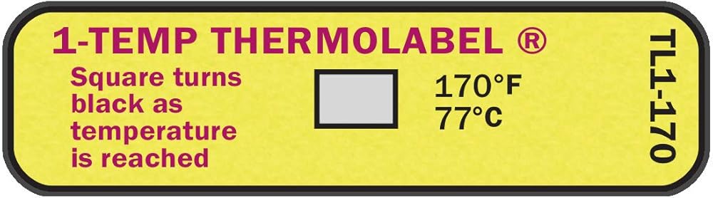 Our completely waterproof 1-Temp Thermolabel features a temperature sensitive element that produces a non-reversible white to black color change at the rated temperature. This provides a clear indication that the temperature has been reached. The temperature element is fully enclosed and protected with a clear plastic overlay, providing both moisture protection and durability, making these labels ideal for a wide range of applications. The self-adhering indicators are available in packages of 24 labels each. Store in a cool, dry place.