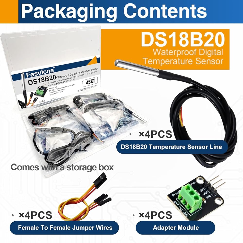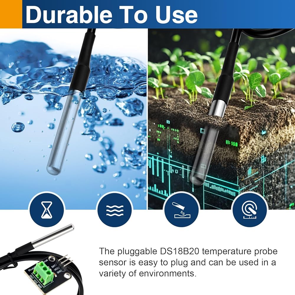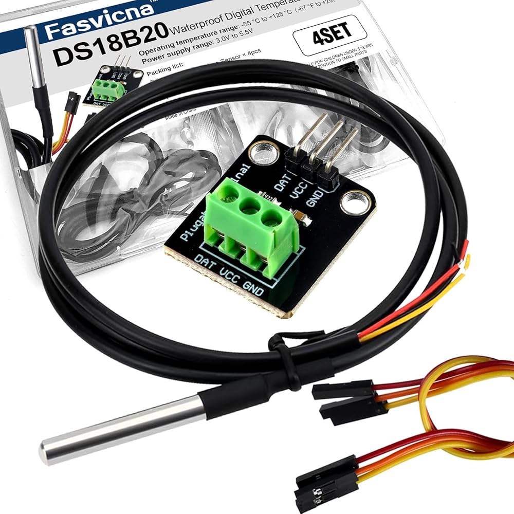 Waterproof DS18B20-compatible digital temperature sensor kit — includes 4 stainless-steel waterproof probes, 4 plugable terminal adapters (model DFR0055) and 4 sensor cables (model FIT0011). Each probe measures −55 °C to +125 °C (typical ±0.5 °C from −10 °C to +85 °C), with selectable 9–12 bit resolution (12-bit LSB = 0.0625 °C) and conversion time up to ~750 ms at 12-bit. Modules communicate over the 1-Wire bus and carry unique 64-bit ROM IDs for reliable multi-point monitoring; operate on 3.0–5.5 V — wire VCC → GND → DATA with a 4.7 kΩ pull-up and read via standard 1-Wire libraries on common 3.3 V / 5 V controllers. The probes are corrosion-resistant and water-sealed, supplied with ≈1 m PVC/PTFE leads (leads are not fully waterproof or flame-retardant; max continuous cable temp ≈85 °C) — seal cable joints for permanent submersion. Designed for fast, stable digital readings in wet or humid conditions, this kit is ideal for aquariums, refrigeration, HVAC, greenhouses, cable ducts, home-brewing and industrial temperature monitoring.