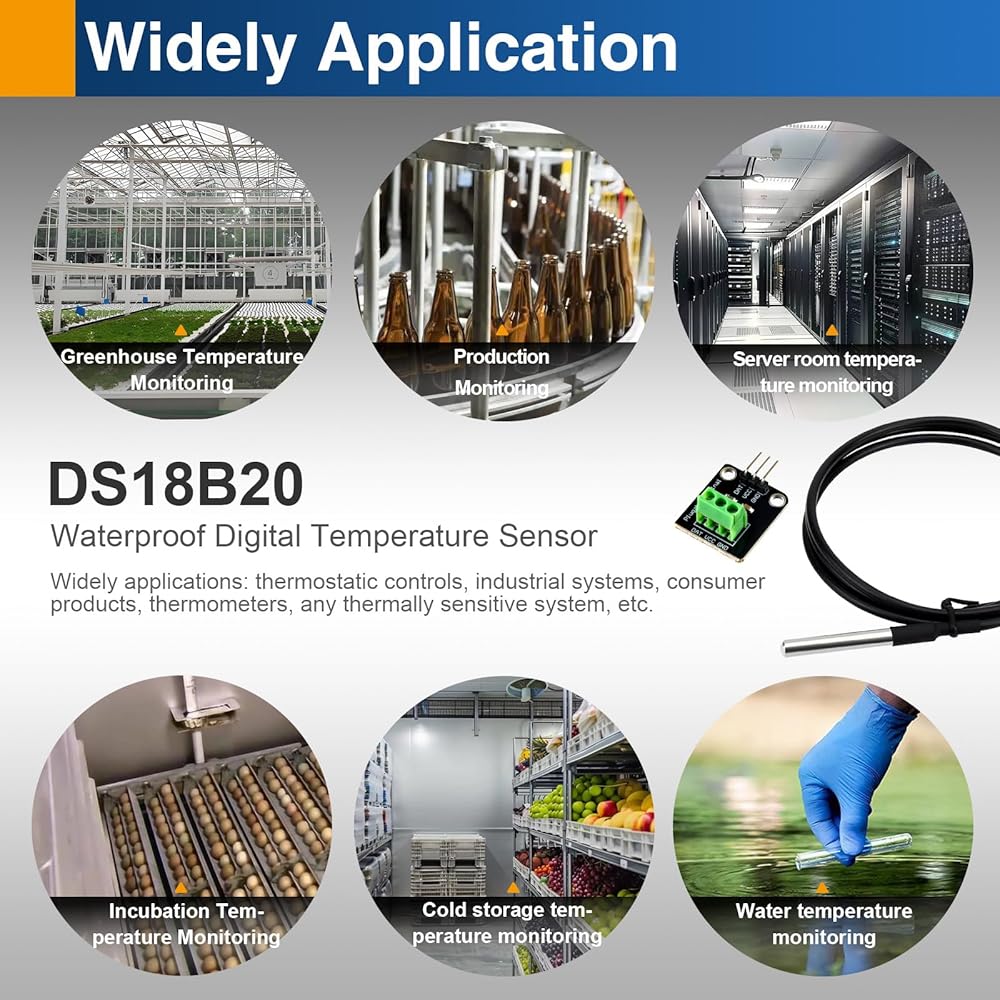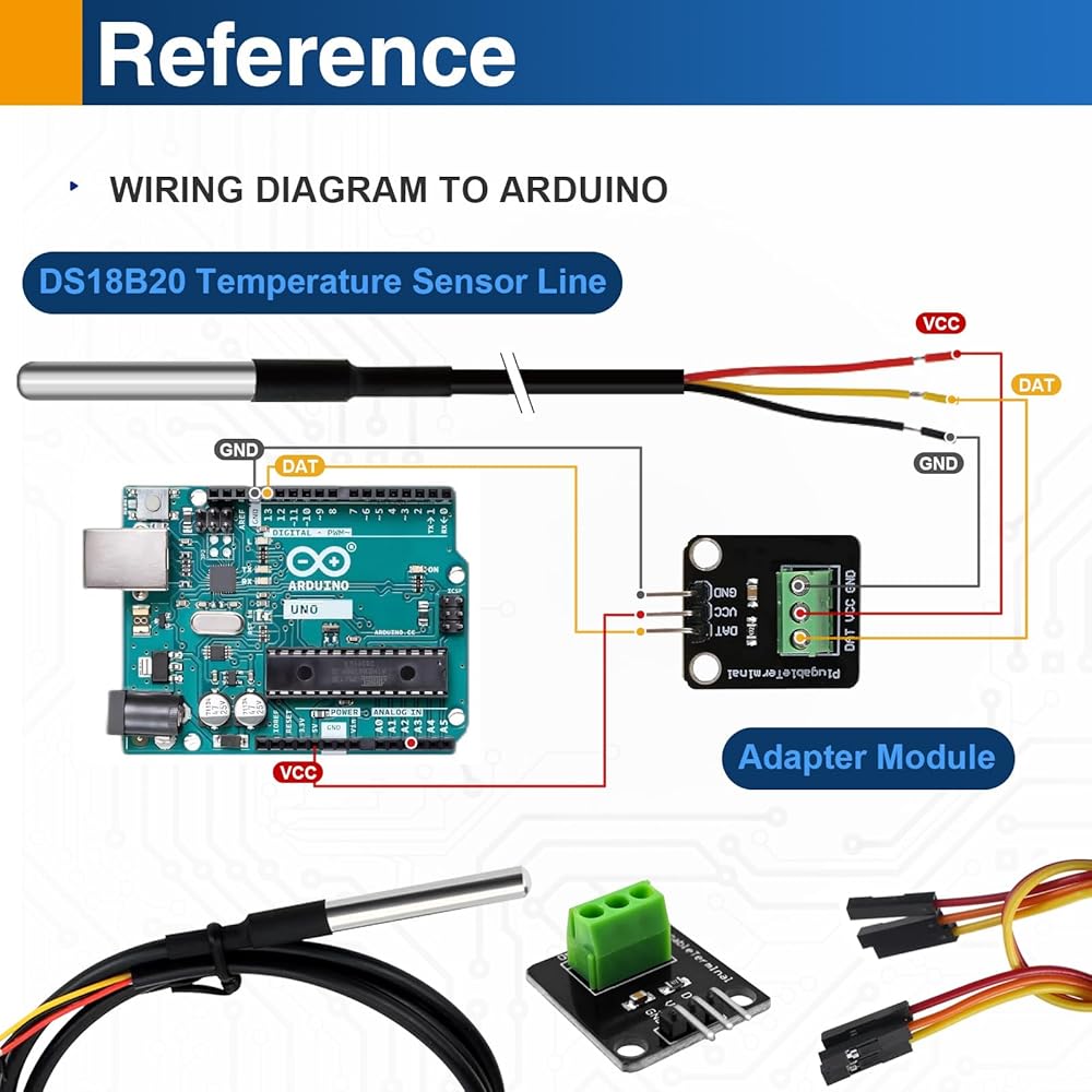 • Quick installation: Insert each probe into a plugable terminal adapter (e.g., DFR0055) and connect to a host device (microcontrollers or single-board computers). Wire VCC (3.0–5.5 V) → GND → DATA (1-Wire) with a 4.7 kΩ pull-up on DATA, and use standard 1-Wire libraries (for example, the DallasTemperature library) to read values. Calibrate with a short water bath or known temperature before deployment and seal all connections.