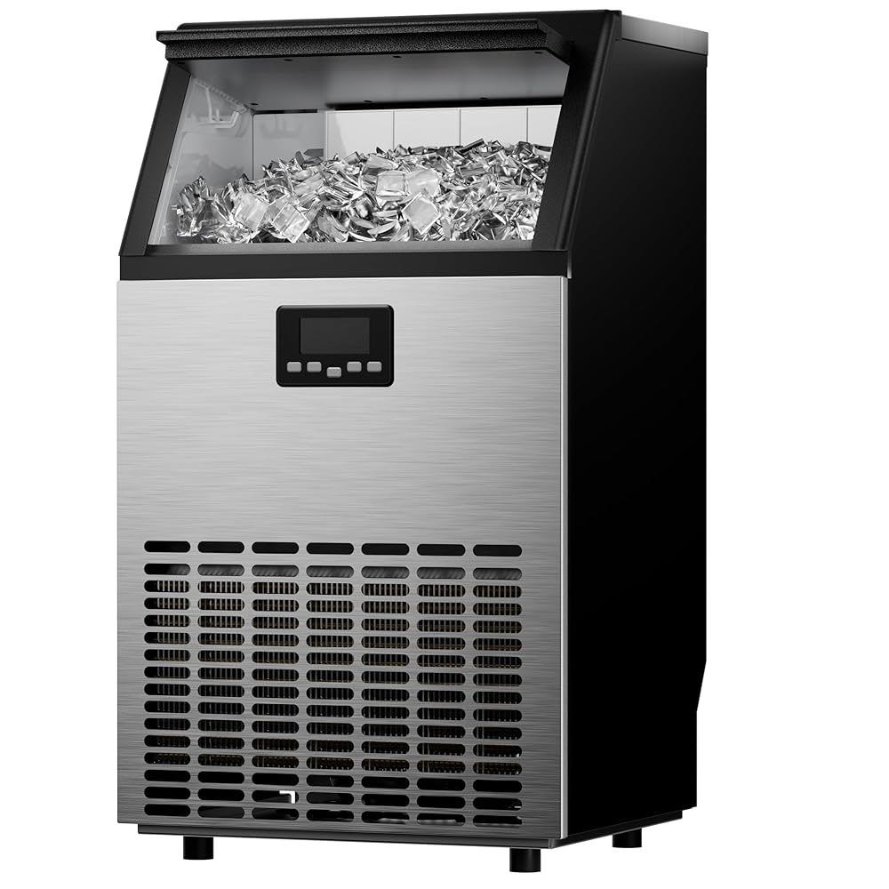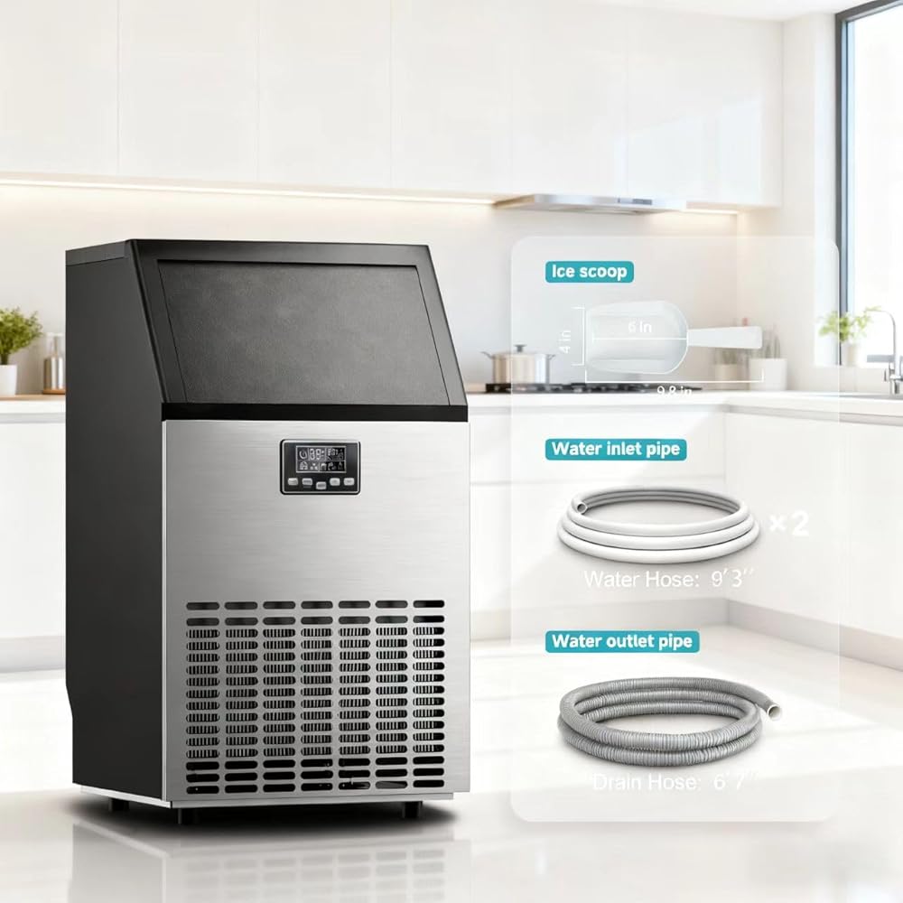 Smart Control & Automated Operation: Featuring an intuitive LCD panel, this commercial ice maker puts full control at your fingertips. The display shows ambient temperature, helping you maintain optimal ice-making conditions. Easily adjust ice thickness by modifying production time, or use the 24-hour timer to schedule automatic start/stop cycles. With a dedicated clean button, the unit performs automated self-cleaning—ensuring consistent performance with minimal effort.