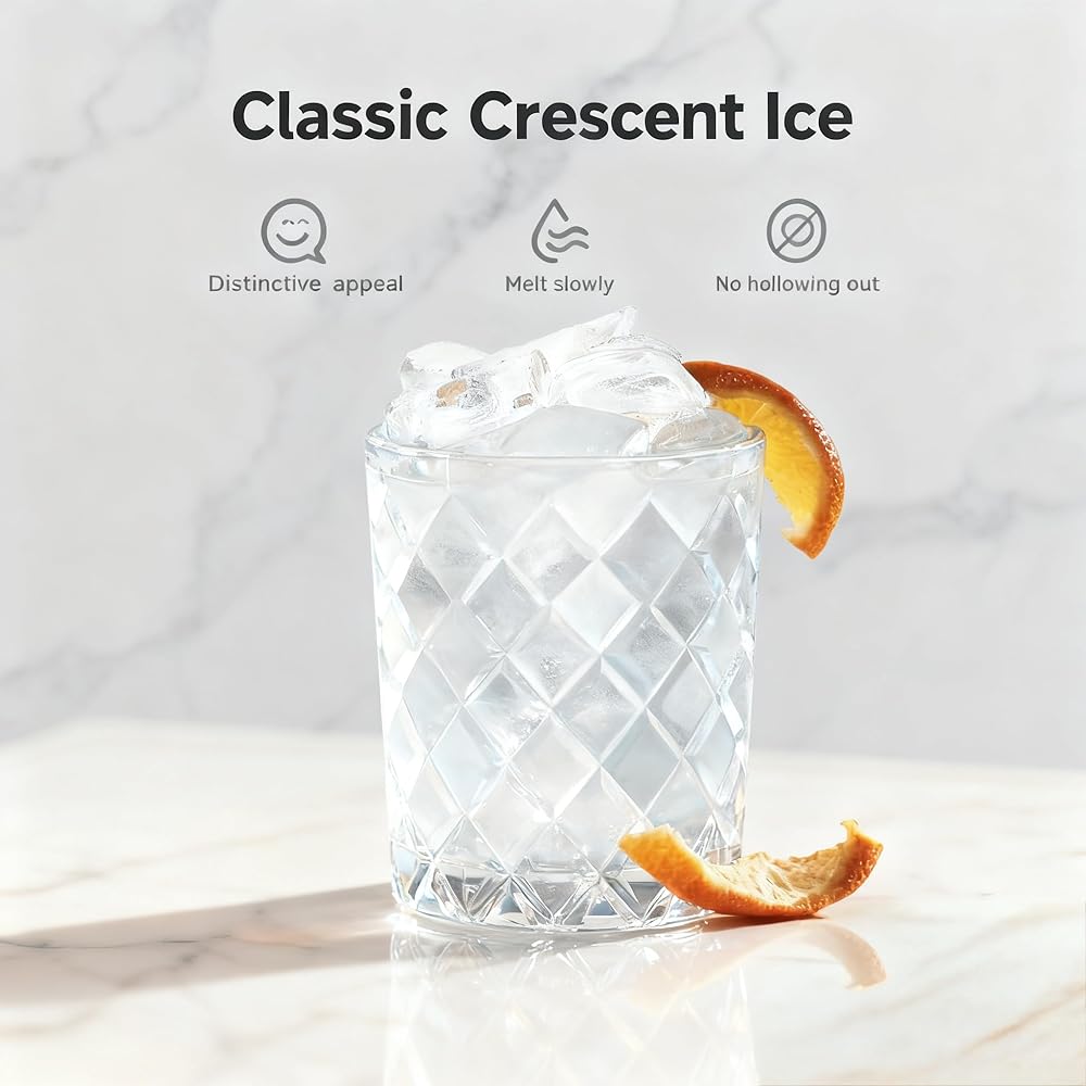 Upgraded Crescent Ice Machine: For serving chilled beverages, fresh seafood, or perfectly crafted cocktails, one element is essential—high-quality ice. That's where our enhanced ice maker stands out. Designed to deliver superior cooling performance and crystal-clear crescent-shaped ice, this machine produces slow-melting, solid cubes that resist hollowing. Ideal for iced drinks, food presentation, catering, and more, it brings both efficiency and elegance to any setting.