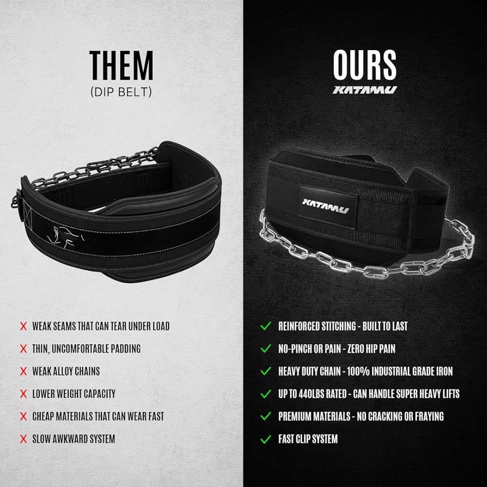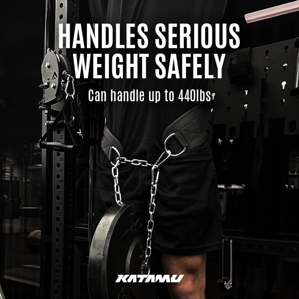 حزام كاتامو ديب مع سلسلة لرفع الأثقال - حزام رفع الأثقال من الجلد الفاخر بسعة وزن 440 رطلًا للسحب والانخفاضات والقرفصاء، ودعم مريح للظهر، شديد التحمل للرجال والنساء